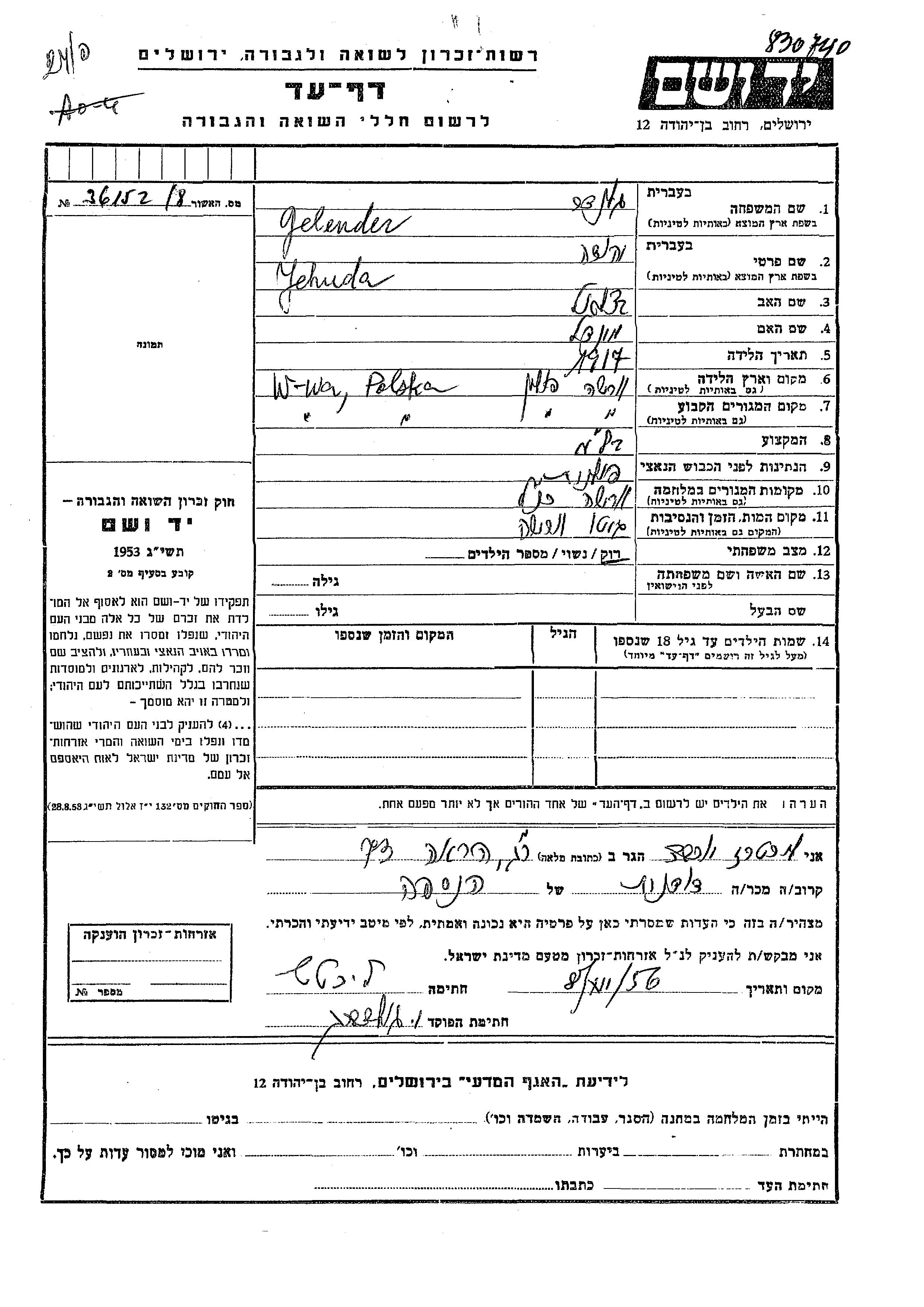 Gelender Yehuda 1917 Warszawa, Pologne Feuille de témoignage