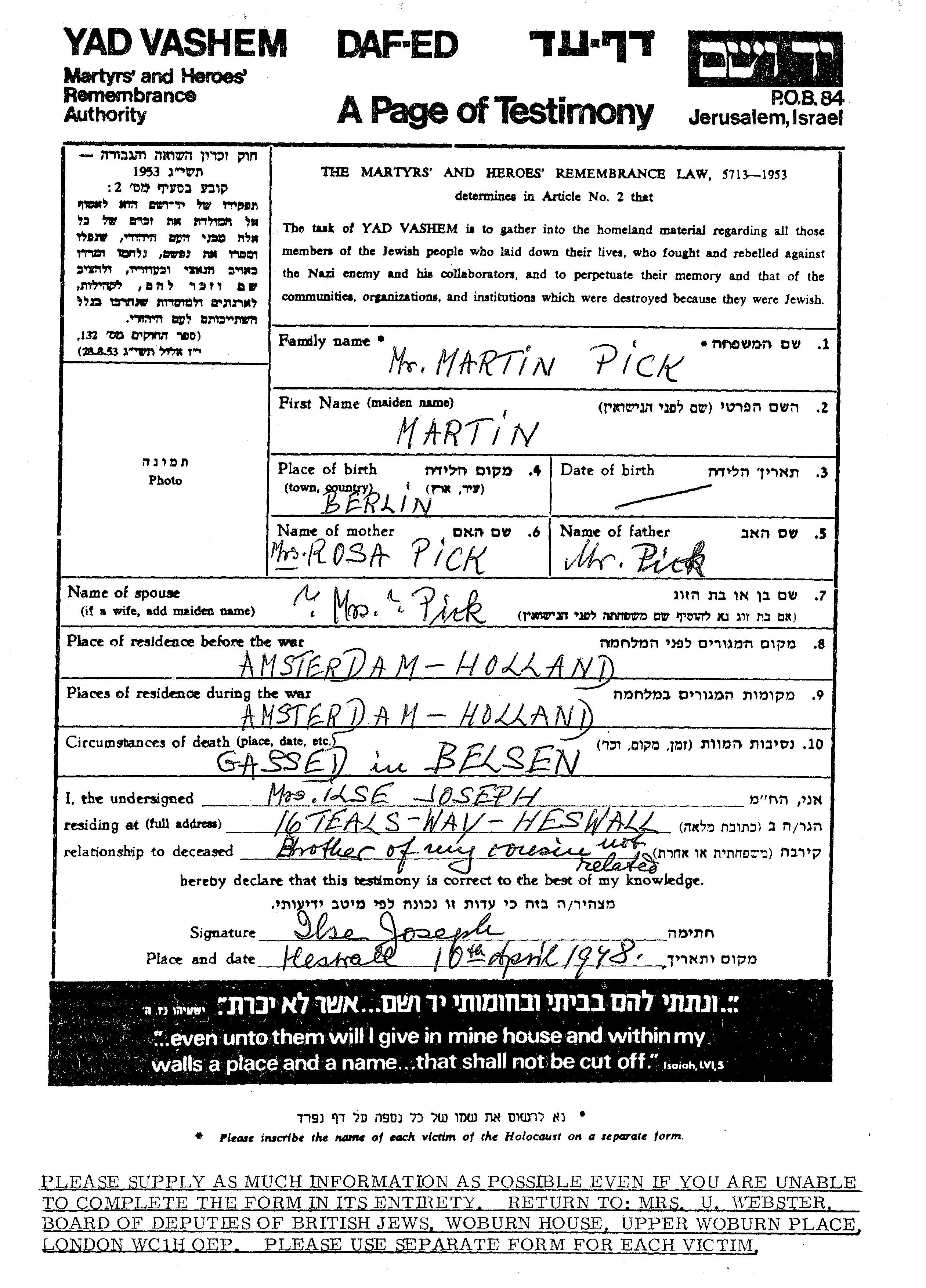 Martin Pick est né à Berlin, Allemagne, fils de Rosa. Il était Marié. Avant la seconde guerre mondiale il vivait à Amsterdam, Pays-Bas. Au cours de la guerre, il était à Amsterdam, Pays-Bas.