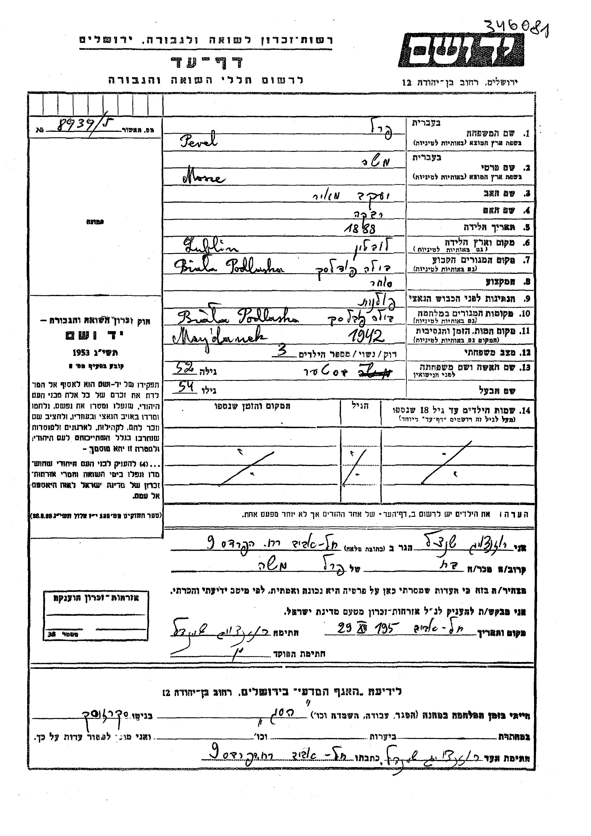 Perl Mosze 1888 Biala Podlaska, Pologne Feuille de témoignage
