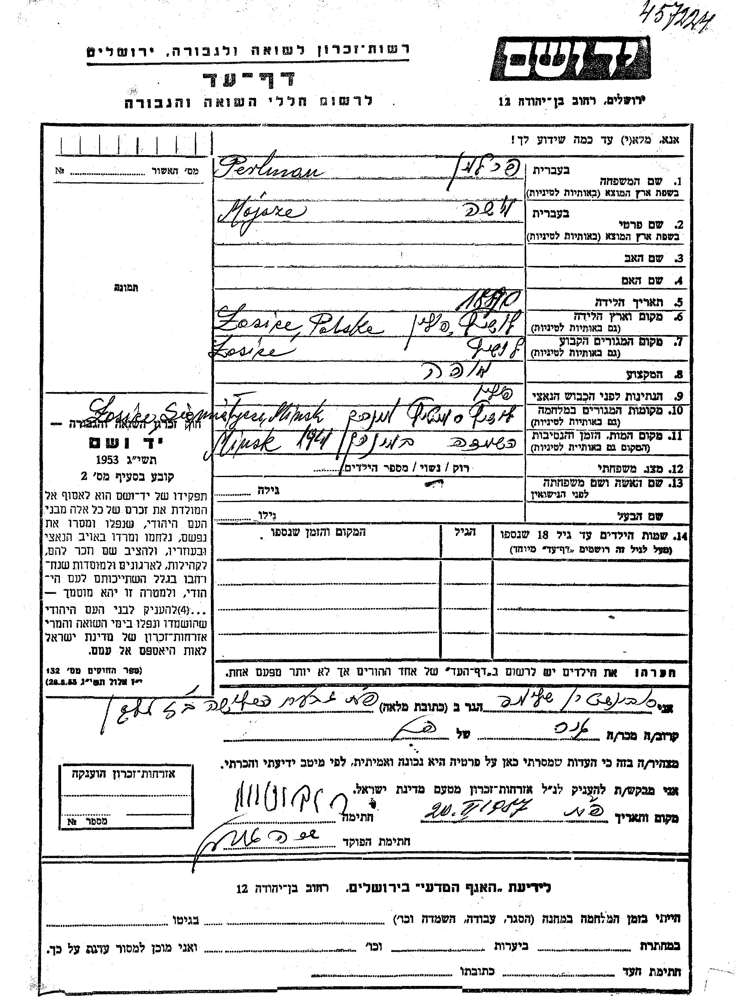 Mojsze Perlman est né à Losice, Pologne en 1870. Il était Boulanger/e et Marié. Avant la seconde guerre mondiale il vivait à Losice, Pologne. Au cours de la guerre, il était à Siemiatycze, Pologne.