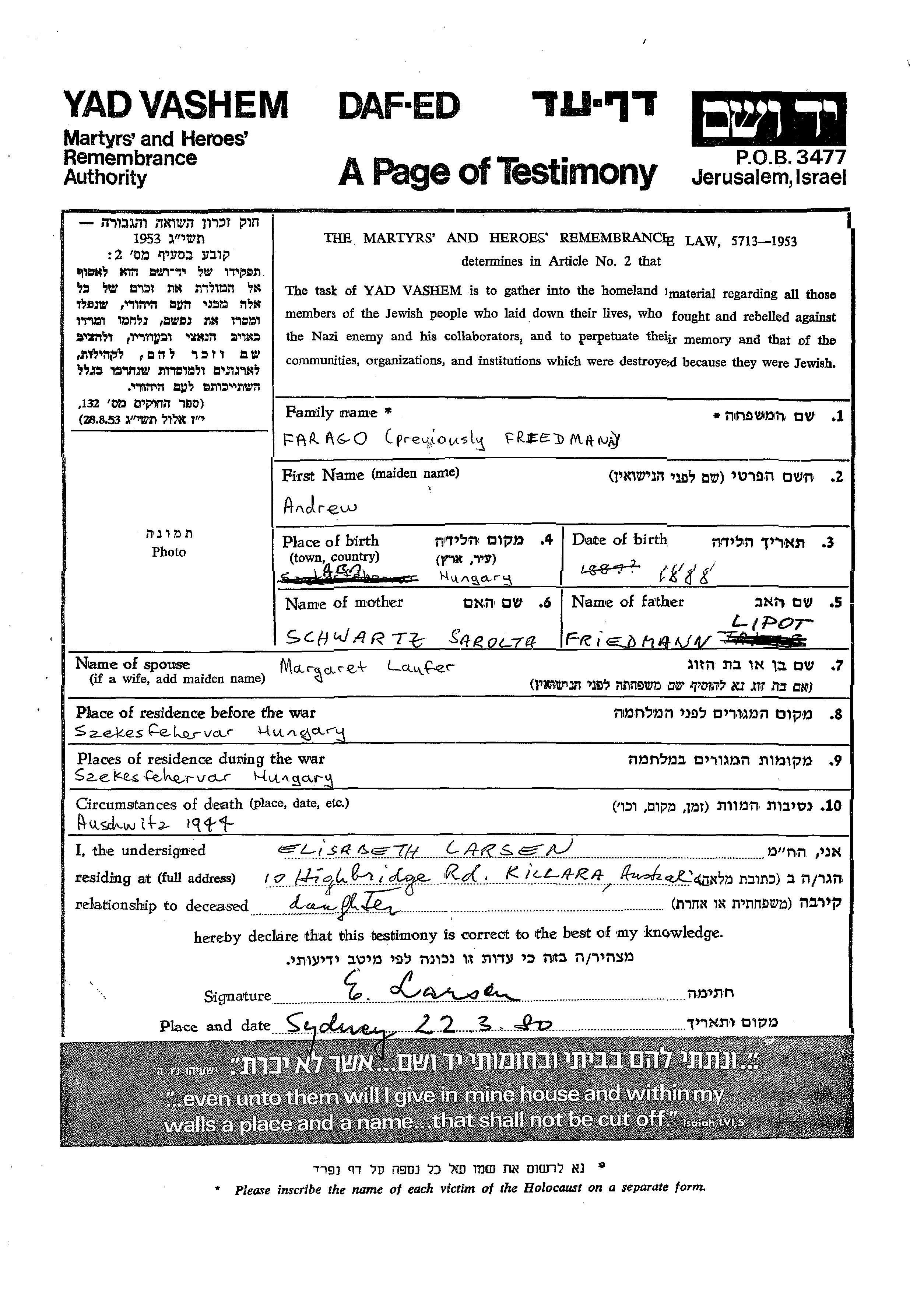 Andreas Farago Friedmann est né à Aba, Hongrie en 1888, fils de Lipot et de Sarolta. Avant la seconde guerre mondiale il vivait à Szekesfehervar, Hongrie. Au cours de la guerre, il était à Szekesfehervar, Hongrie.