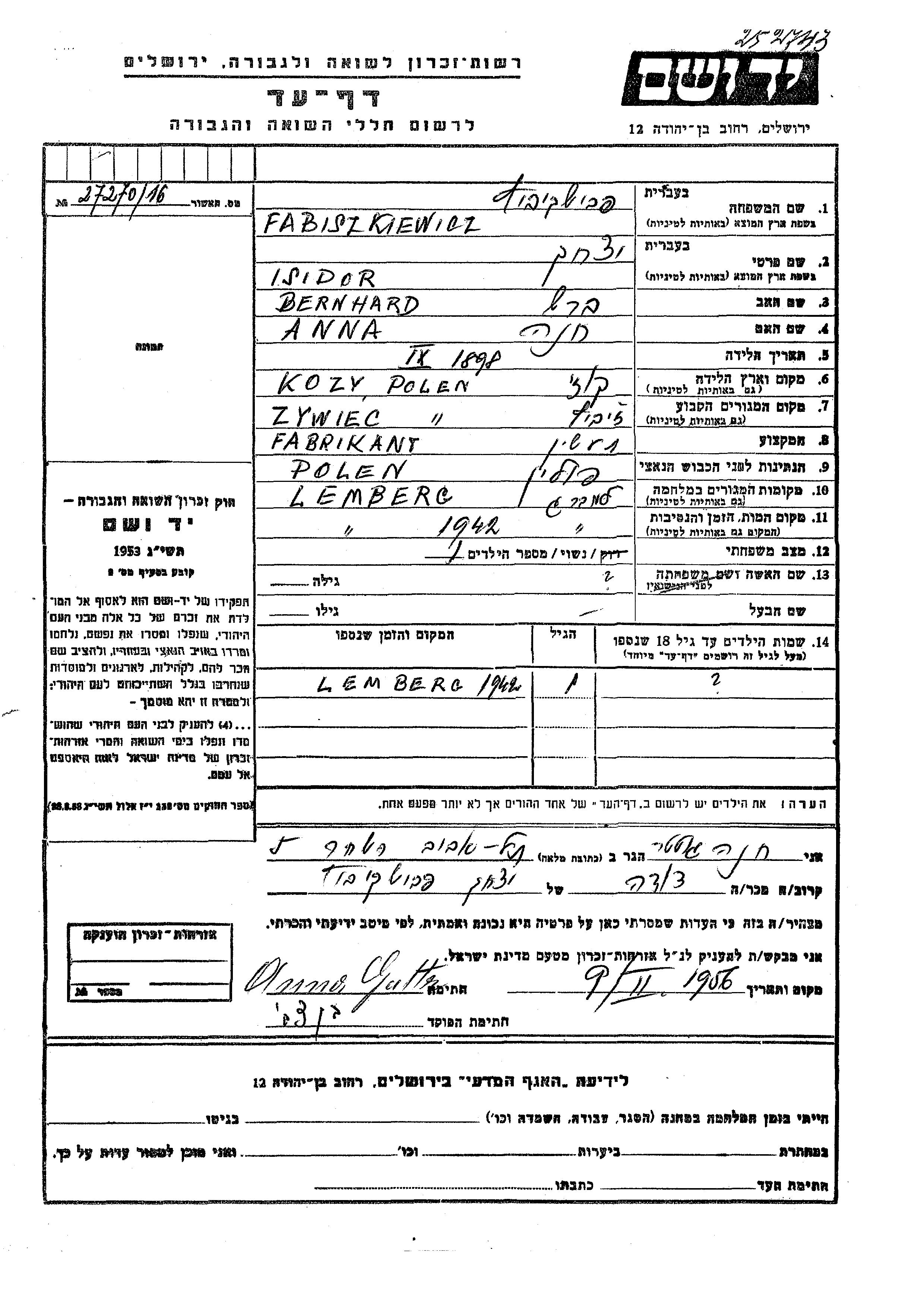 Isidor Yitzkhak Fabiszkiewicz est né à Kozy, Pologne en 1898, fils de Bernhard Beresh et de Anna Khana. Il était Propriétaire d'usine et Marié. Avant la seconde guerre mondiale il vivait à Zywiec, Pologne. Au cours de la guerre, il était à Lemberg, Pologne.