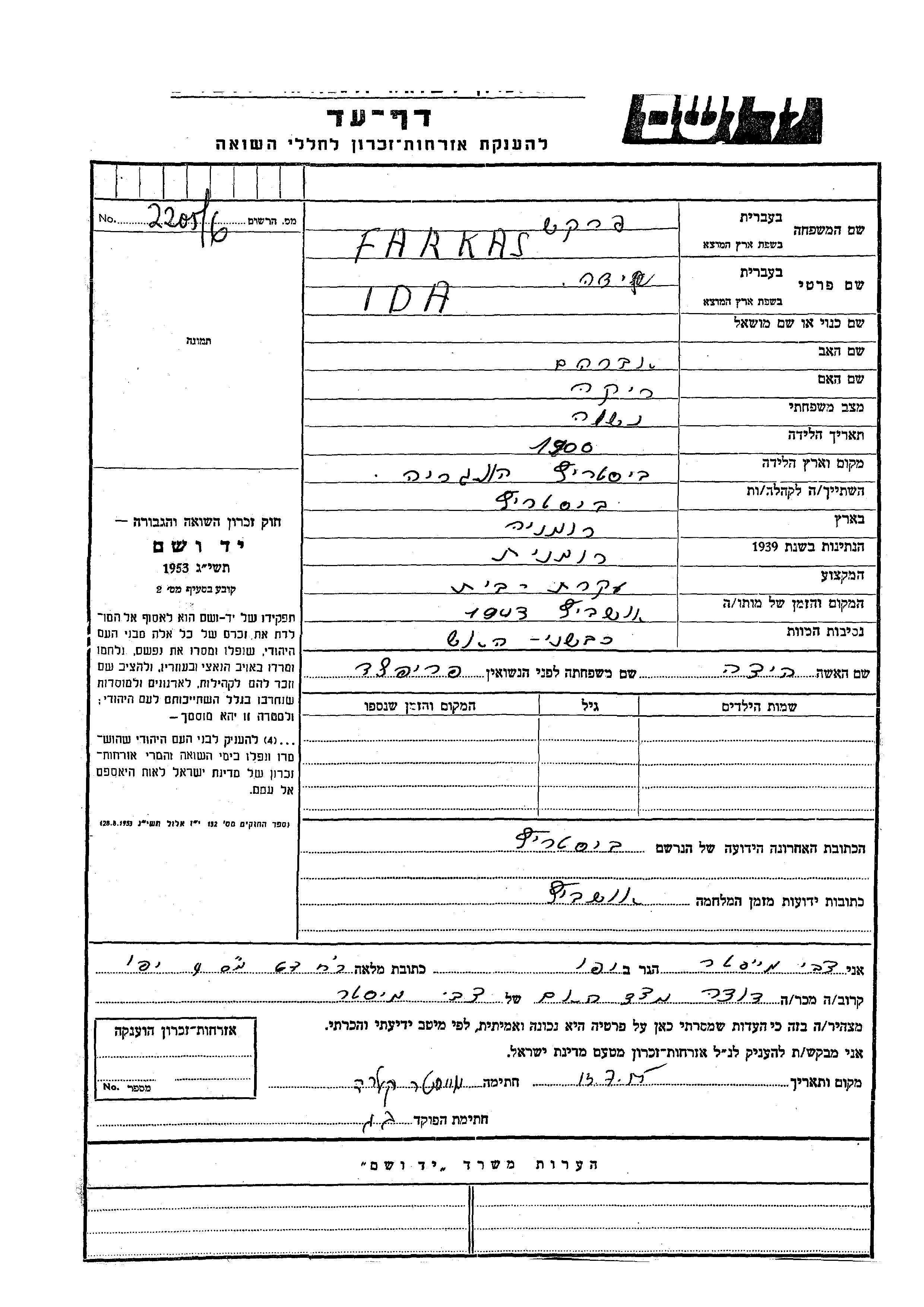 Farkas Ida 1900 Bistrica, Roumanie Feuille de témoignage