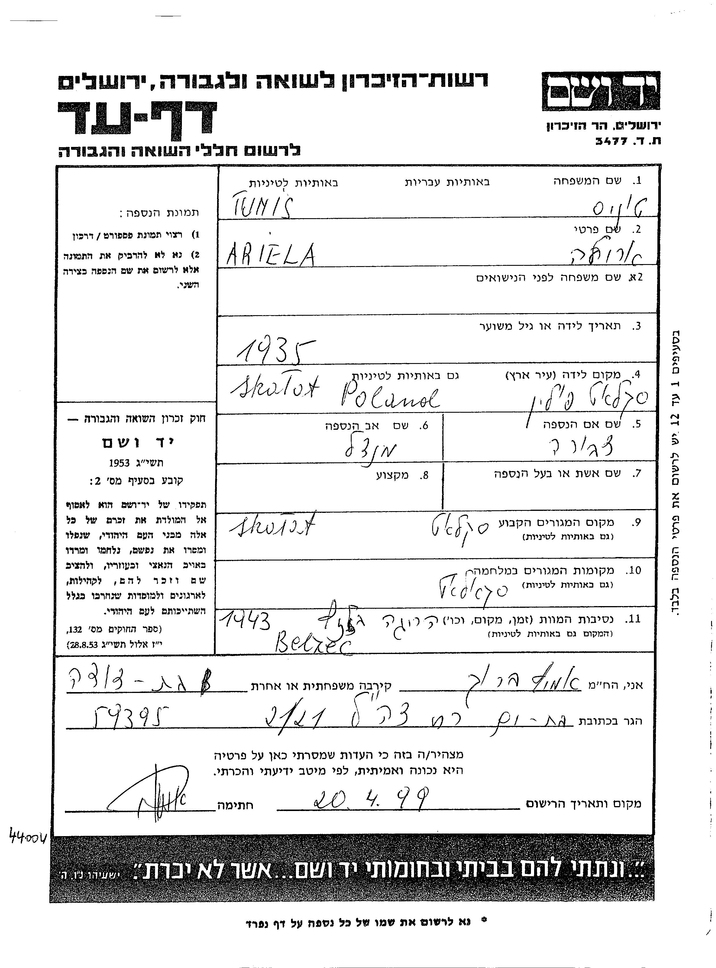 Tunis Ariela 1935 Skalat, Pologne Feuille de témoignage