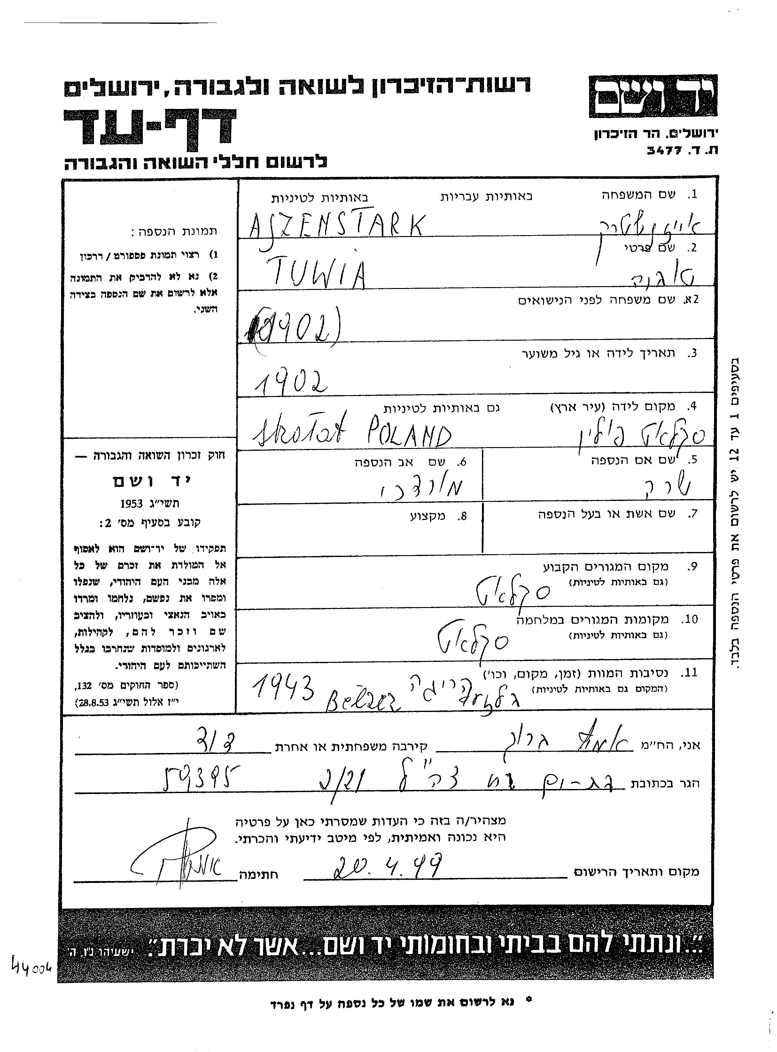 Ajzenstark Tuwia 1902 Skalat, Pologne Feuille de témoignage