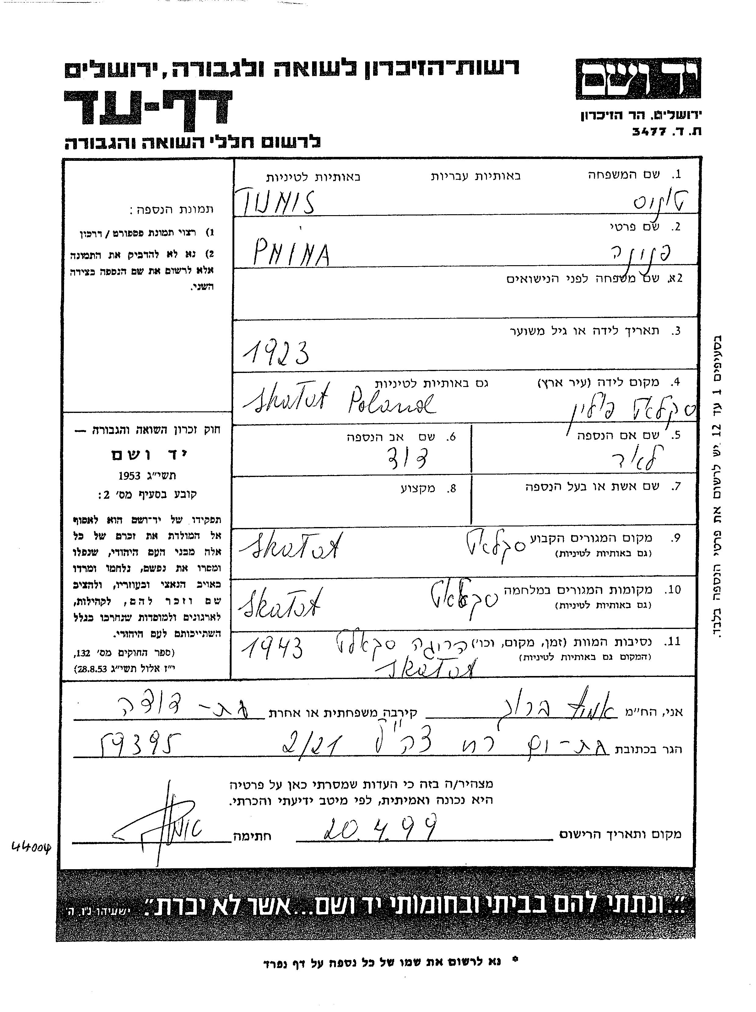 Tunis Pnina 1923 Skalat, Pologne Feuille de témoignage