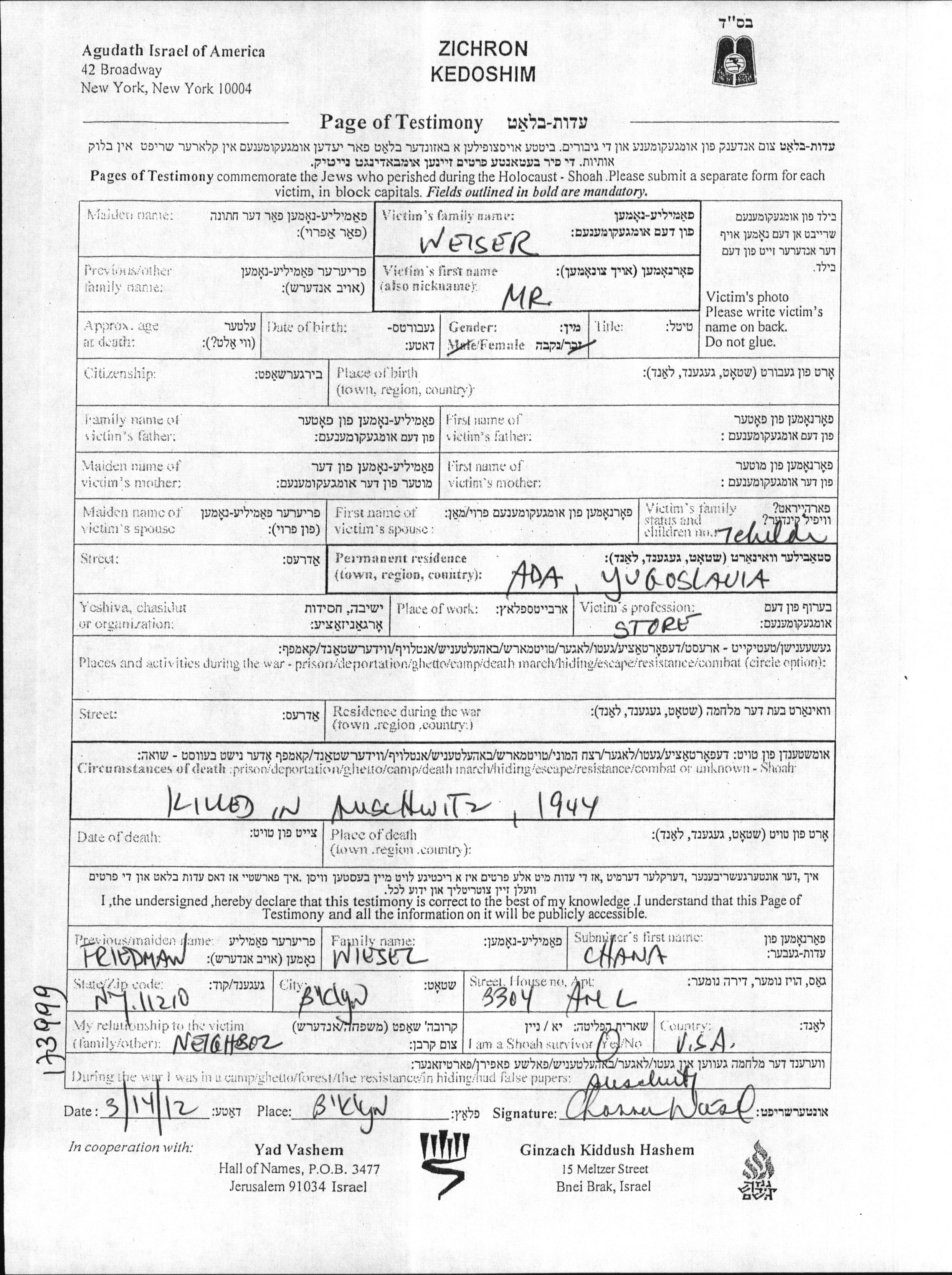Weiser prénom inconnu Ada, Yugoslavie Feuille de témoignage