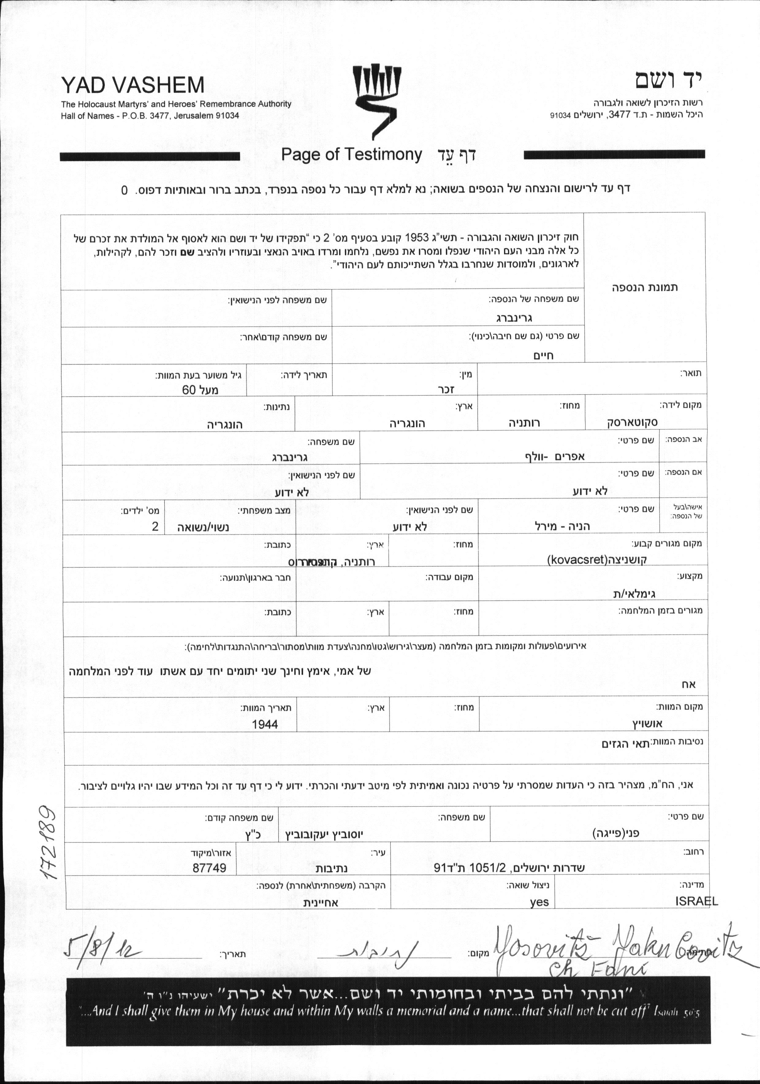 Grinberg Chaim Kovacsret, Tchécoslovaquie Feuille de témoignage (digitale-signée)