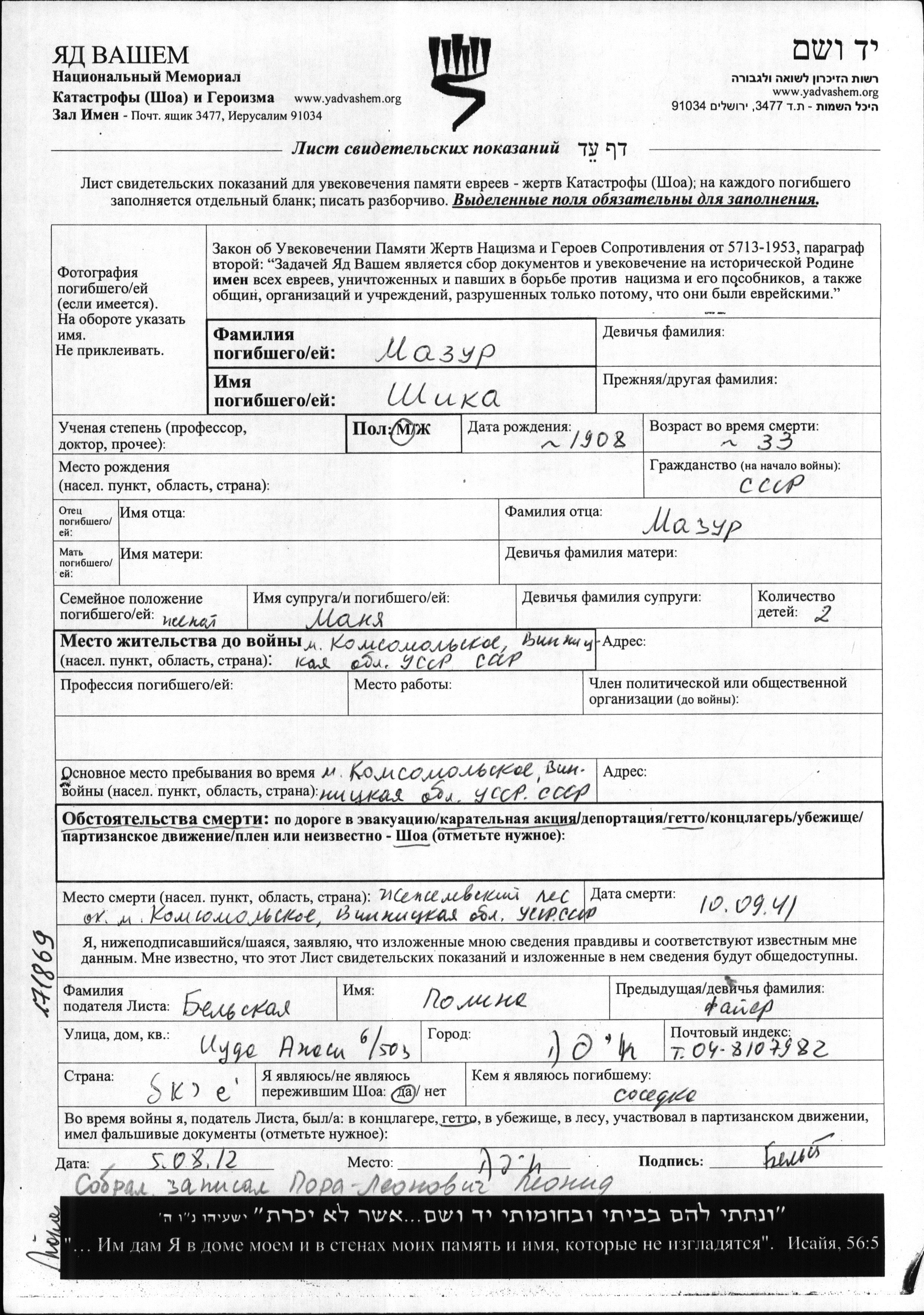 Shika Mazur est né en 1908. Il était Mariée à Manya. Avant la seconde guerre mondiale il vivait à Komsomolskoye, Ukraine (URSS). Au cours de la guerre, il était à Ghetto.