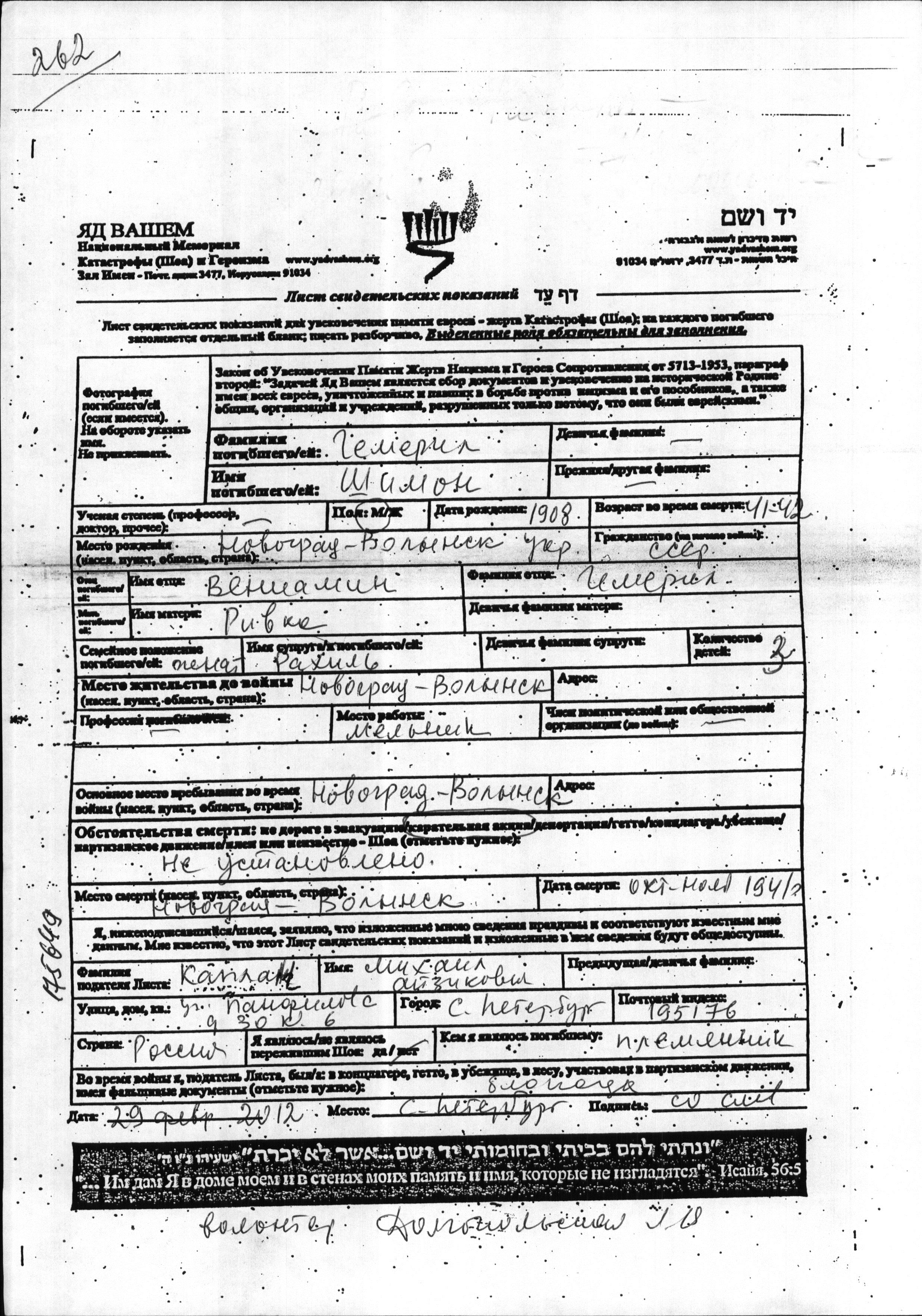 Gemeril Shimon 1908 Novograd Volynsk, Ukraine (URSS) Feuille de témoignage