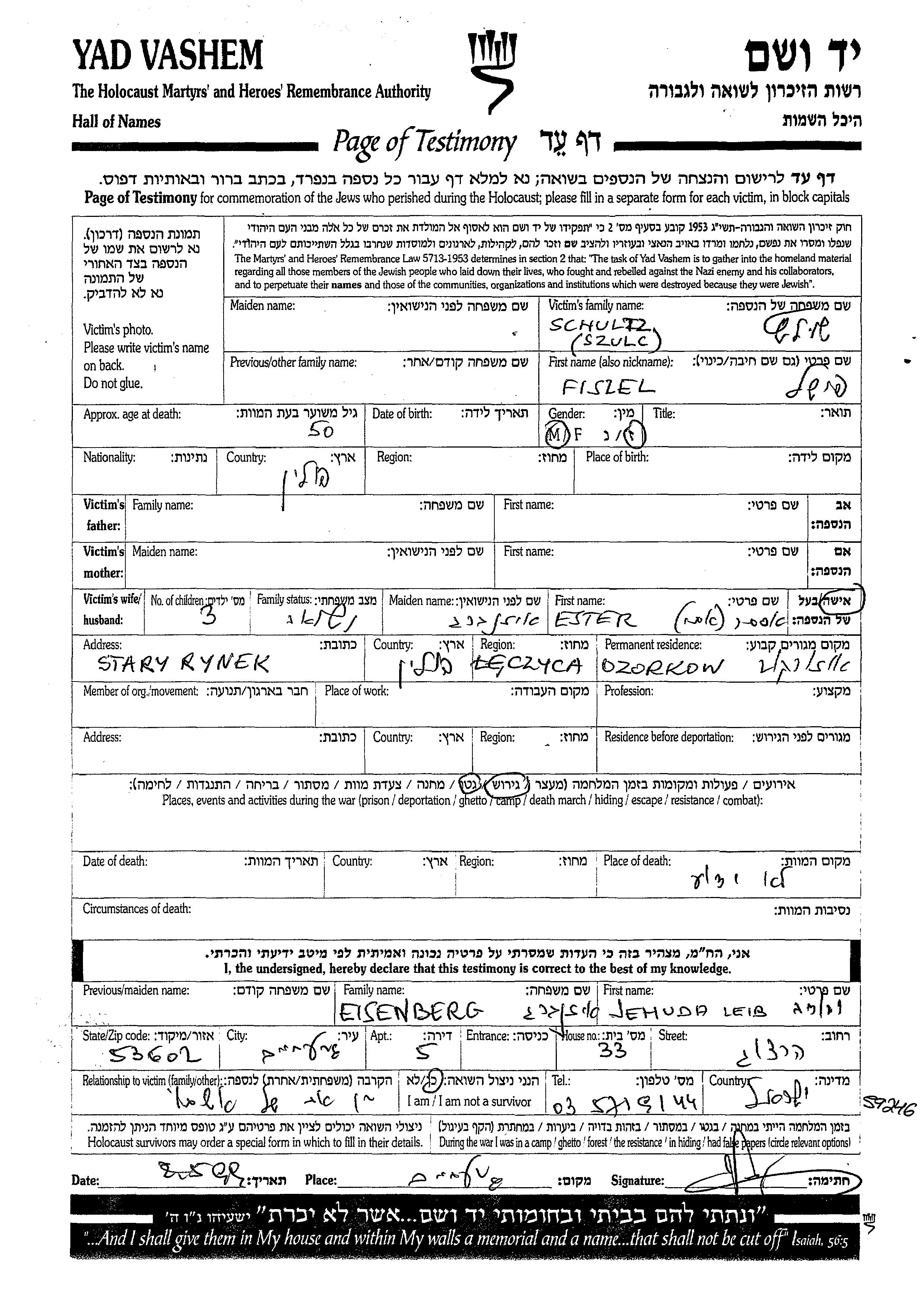 Fiszel Schultz est né à Pologne. Il était Mariée à Ester née Eizenberg. Avant la seconde guerre mondiale il vivait à Ozorkow, Pologne.