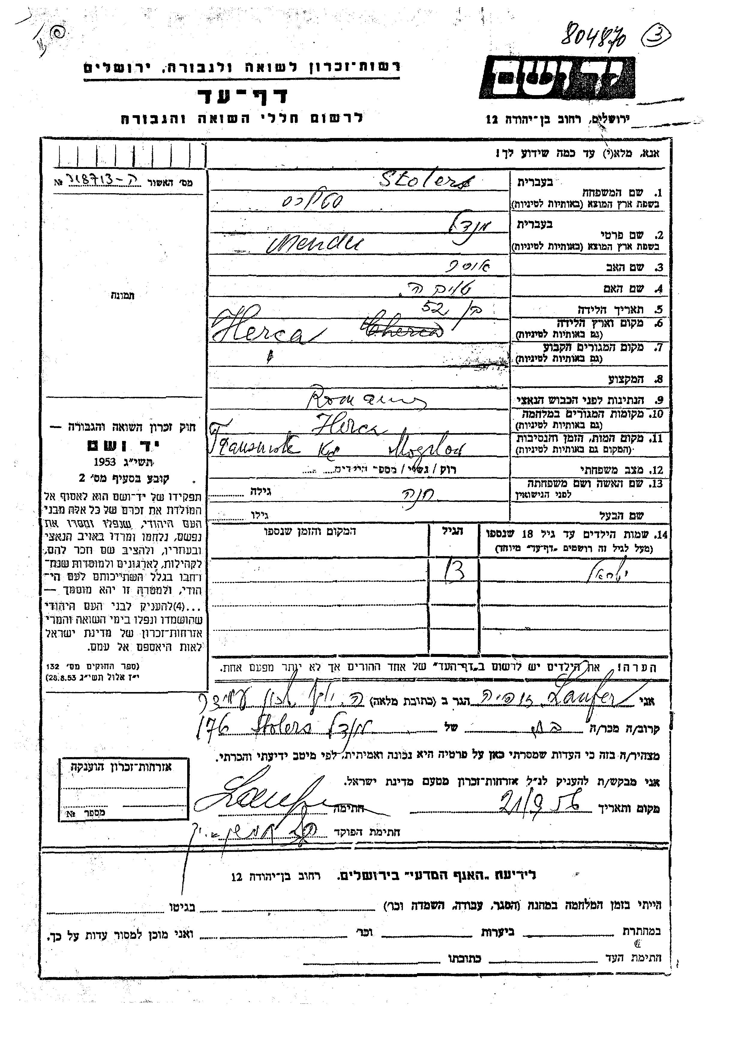 Stolers Stoleru Mendel Herca, Roumanie Feuille de témoignage