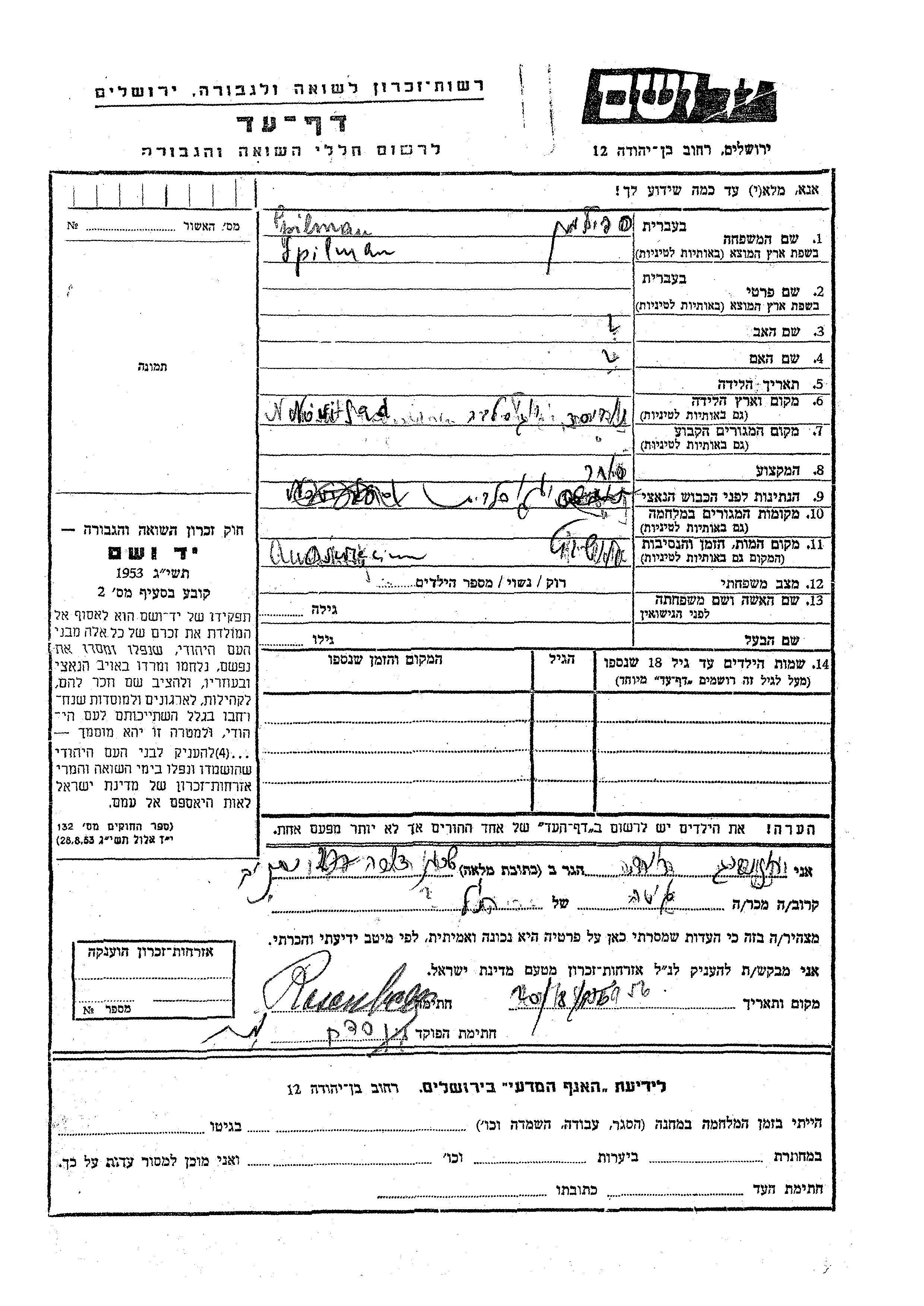 Yad Vashem - Pages of Testimony Names Memorial Collection