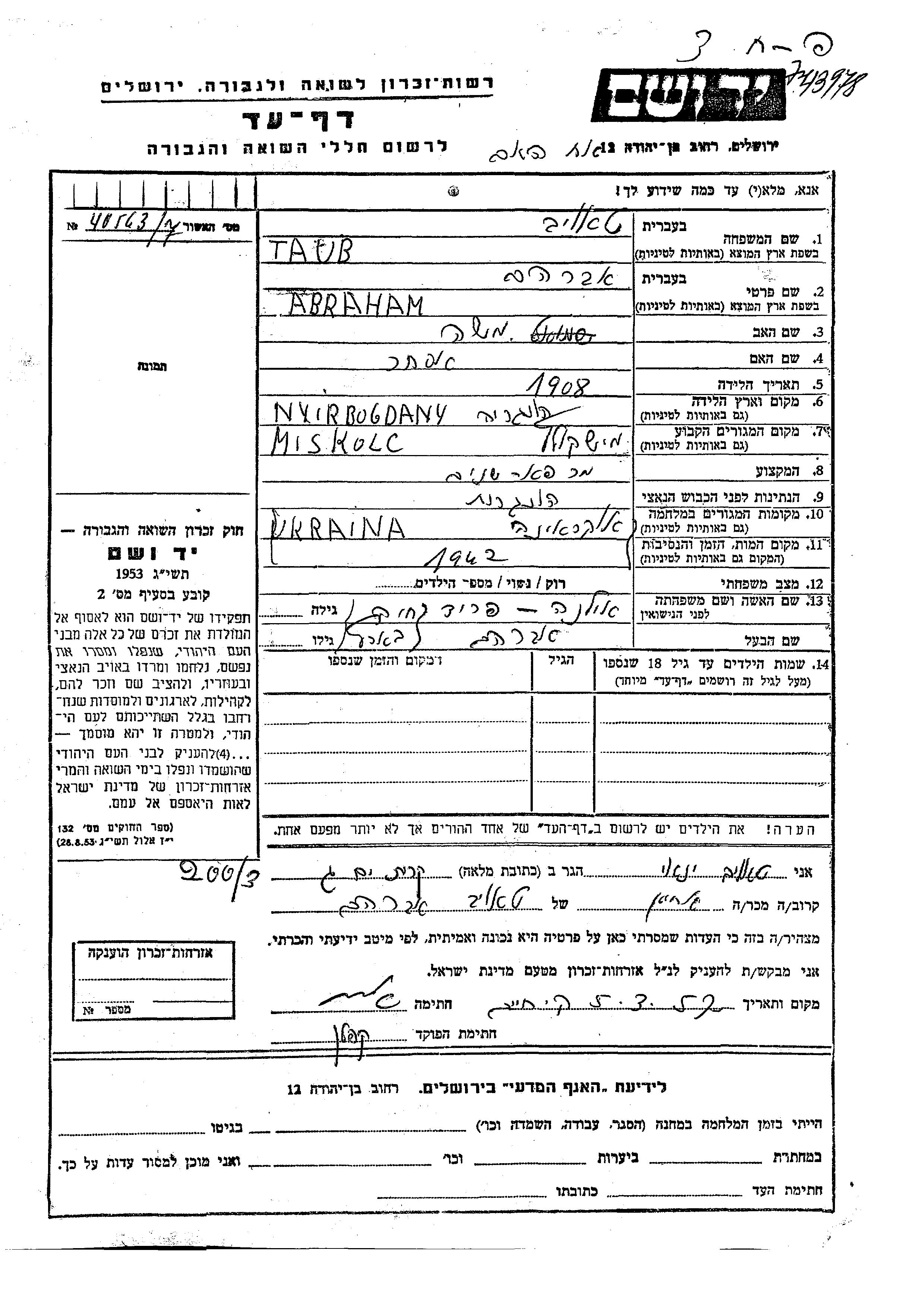Taub Abraham 1908 Miskolc, Hongrie Feuille de témoignage
