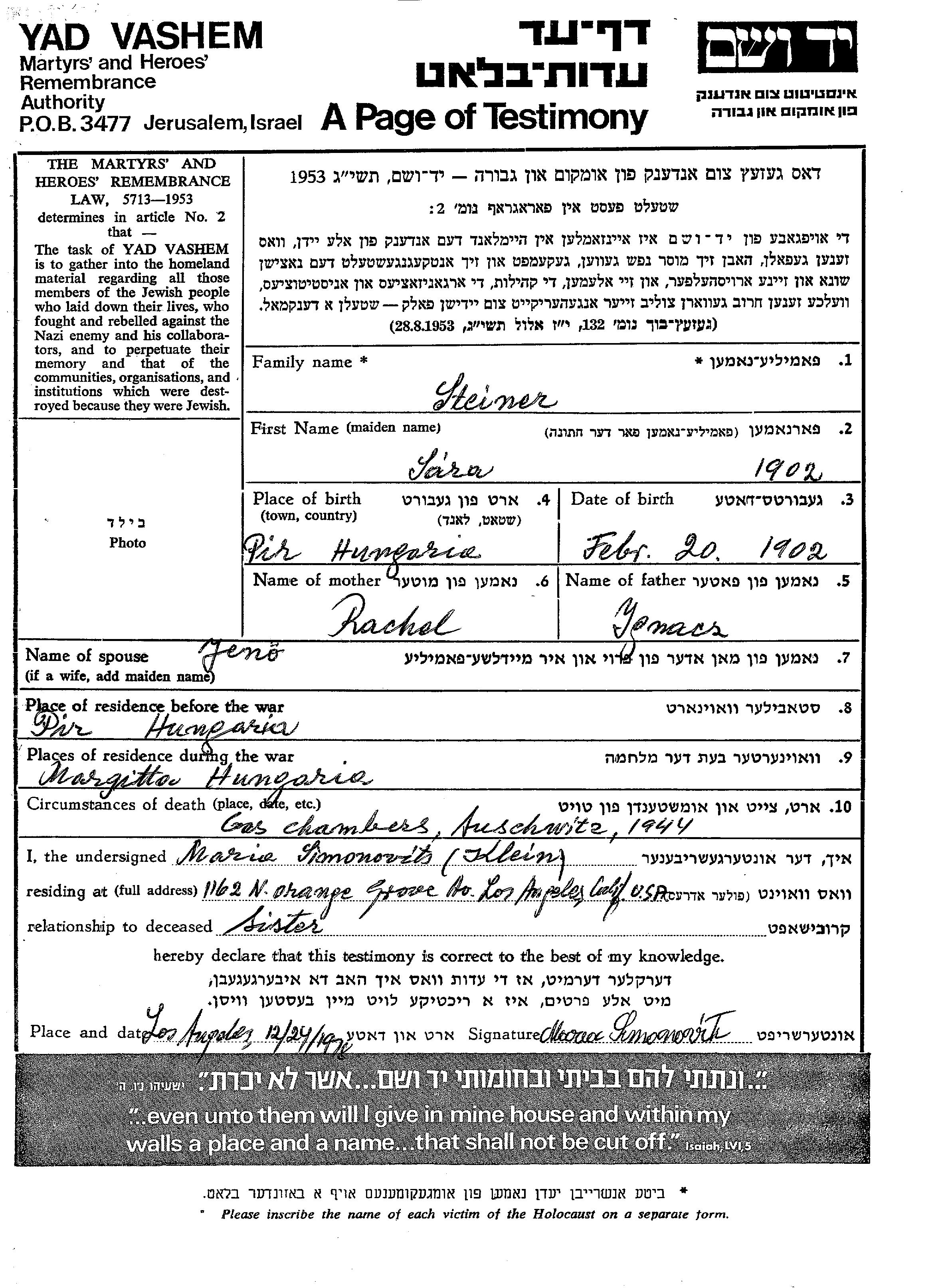 Sara Steiner est née à Pir, Roumanie en 1902, fille de Ignacz et de Rachel. Elle était Mariée à Jeno. Avant la seconde guerre mondiale elle vivait à Pir, Roumanie. Pendant la guerre, elle était à Margitta, Roumanie.