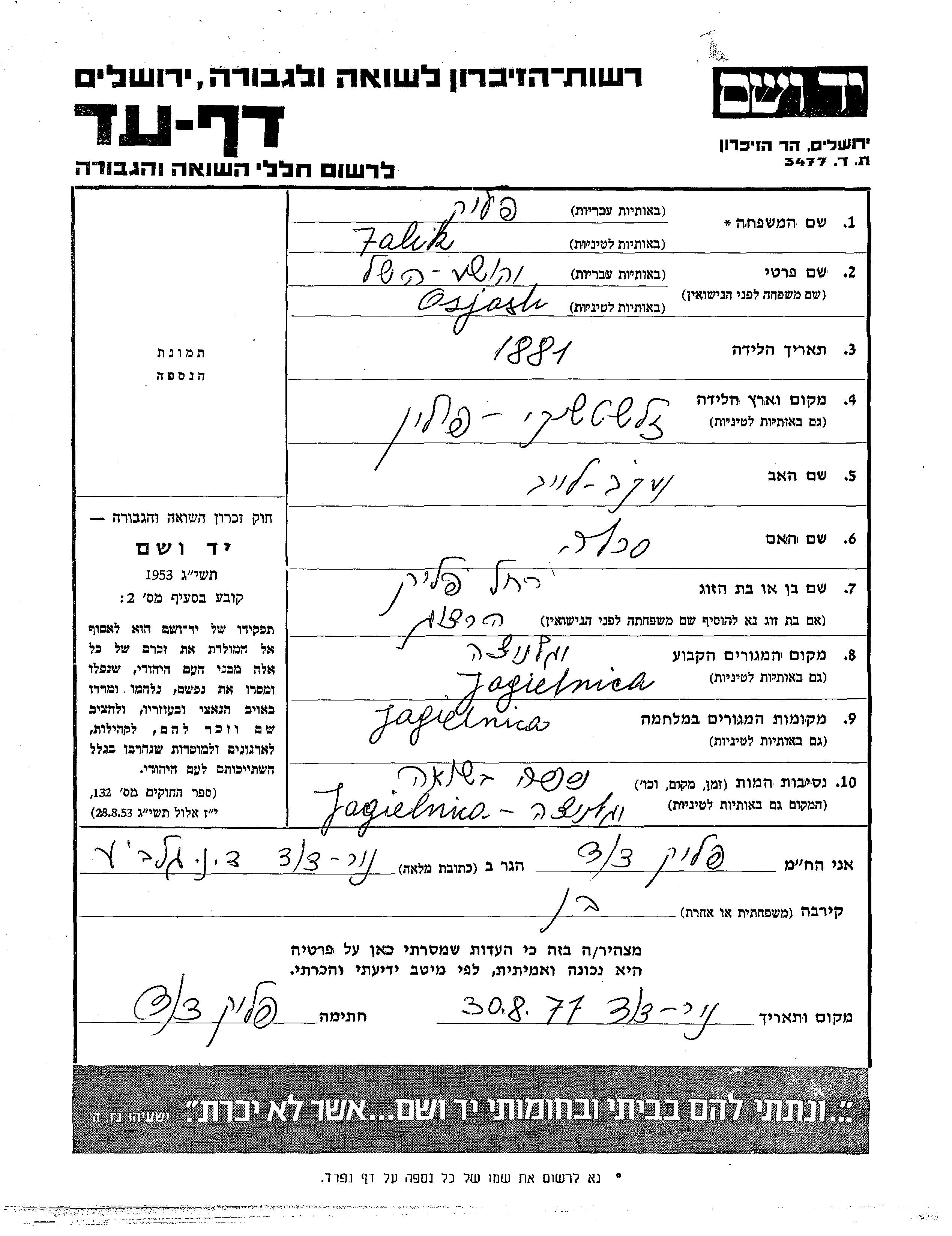 Falik Osjash Yehoshua 1881 Jagielnica, Pologne Feuille de témoignage