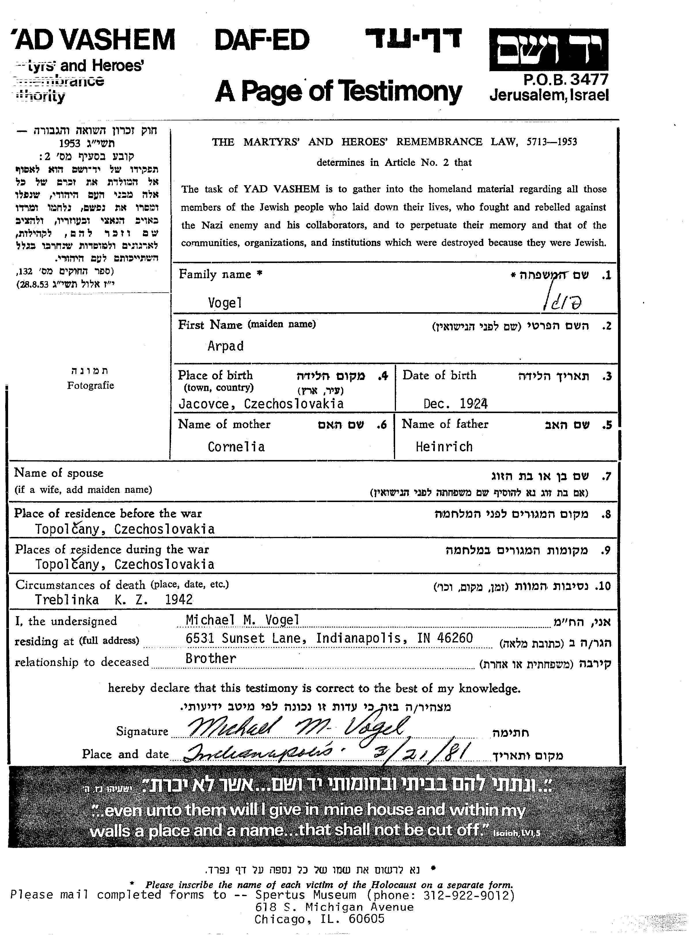 Arpad Vogel est né à Jacovce, Tchécoslovaquie en 1924, fils de Heinrich et de Cornelia. Avant la seconde guerre mondiale il vivait à Topolcany, Tchécoslovaquie. Au cours de la guerre, il était à Topolcany, Tchécoslovaquie.