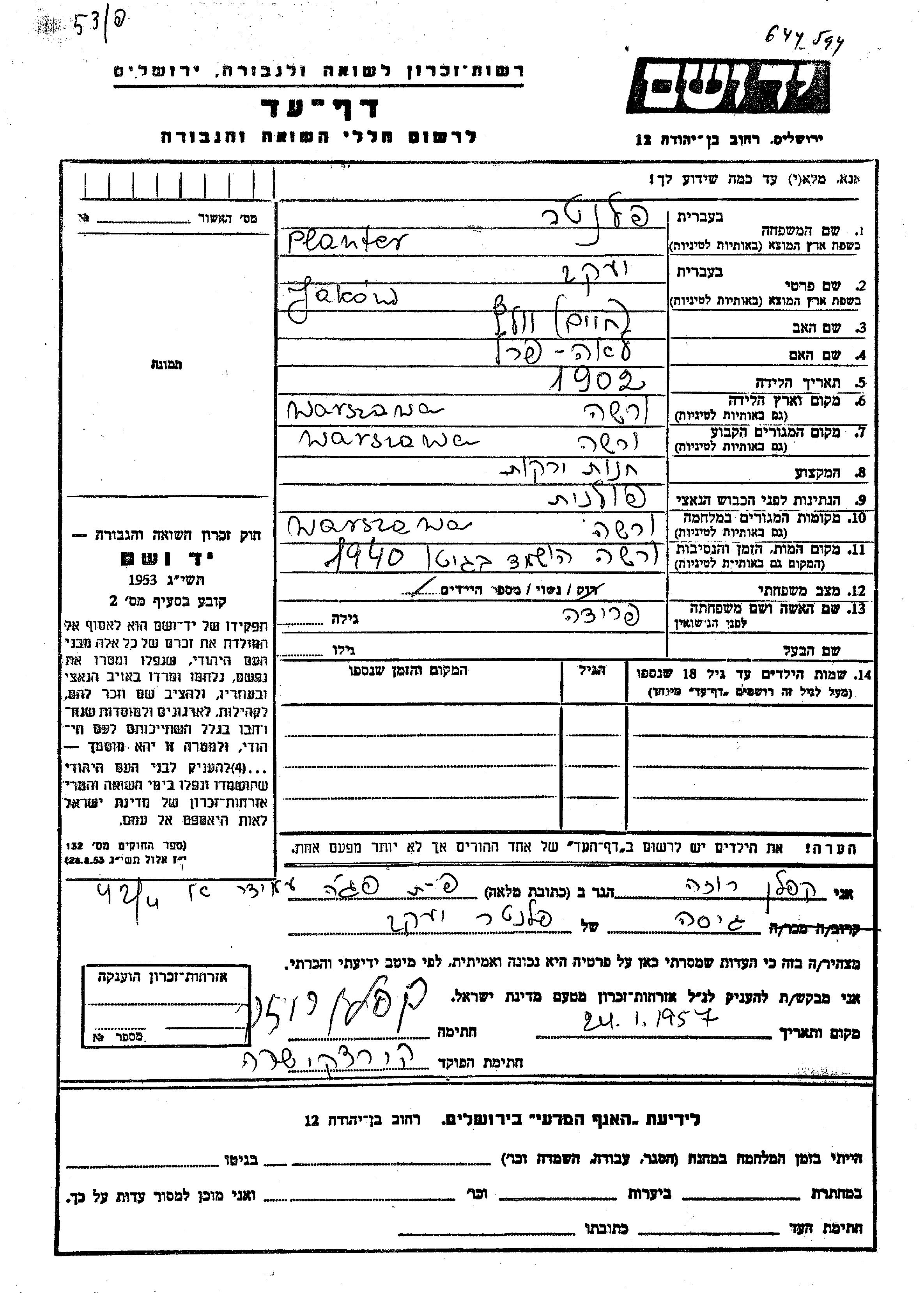 Jakow Planter est né à Warszawa, Pologne en 1902, fils de Volf Khaim et de Lea Perel. Il était Mariée à Frida. Avant la seconde guerre mondiale il vivait à Warszawa, Pologne. Au cours de la guerre, il était à Warszawa, Pologne.