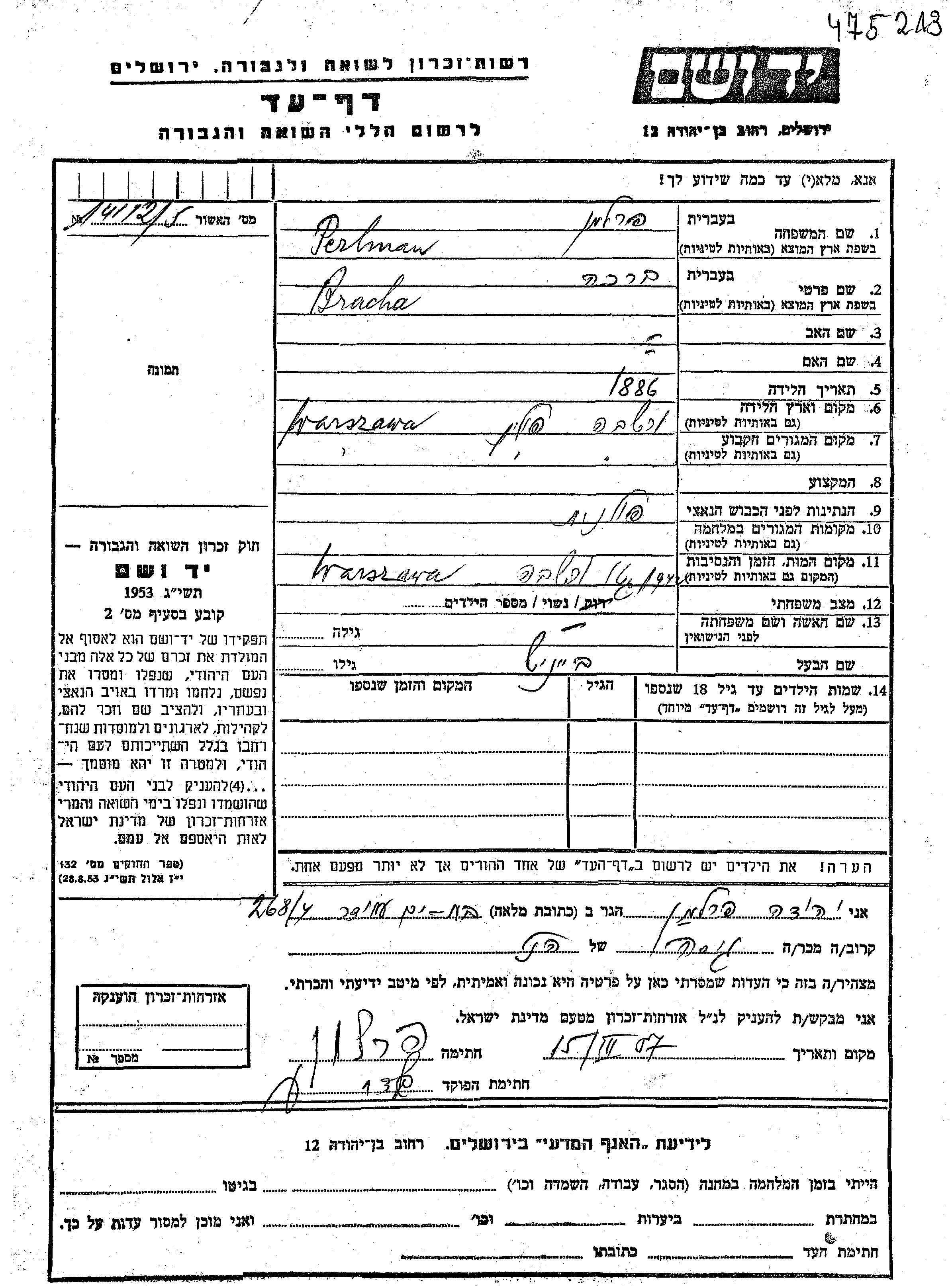Bracha Perlman est née à Warsaw, Pologne en 1886. Elle était Mariée à Beinish. Avant la seconde guerre mondiale elle vivait à Warsaw, Pologne.