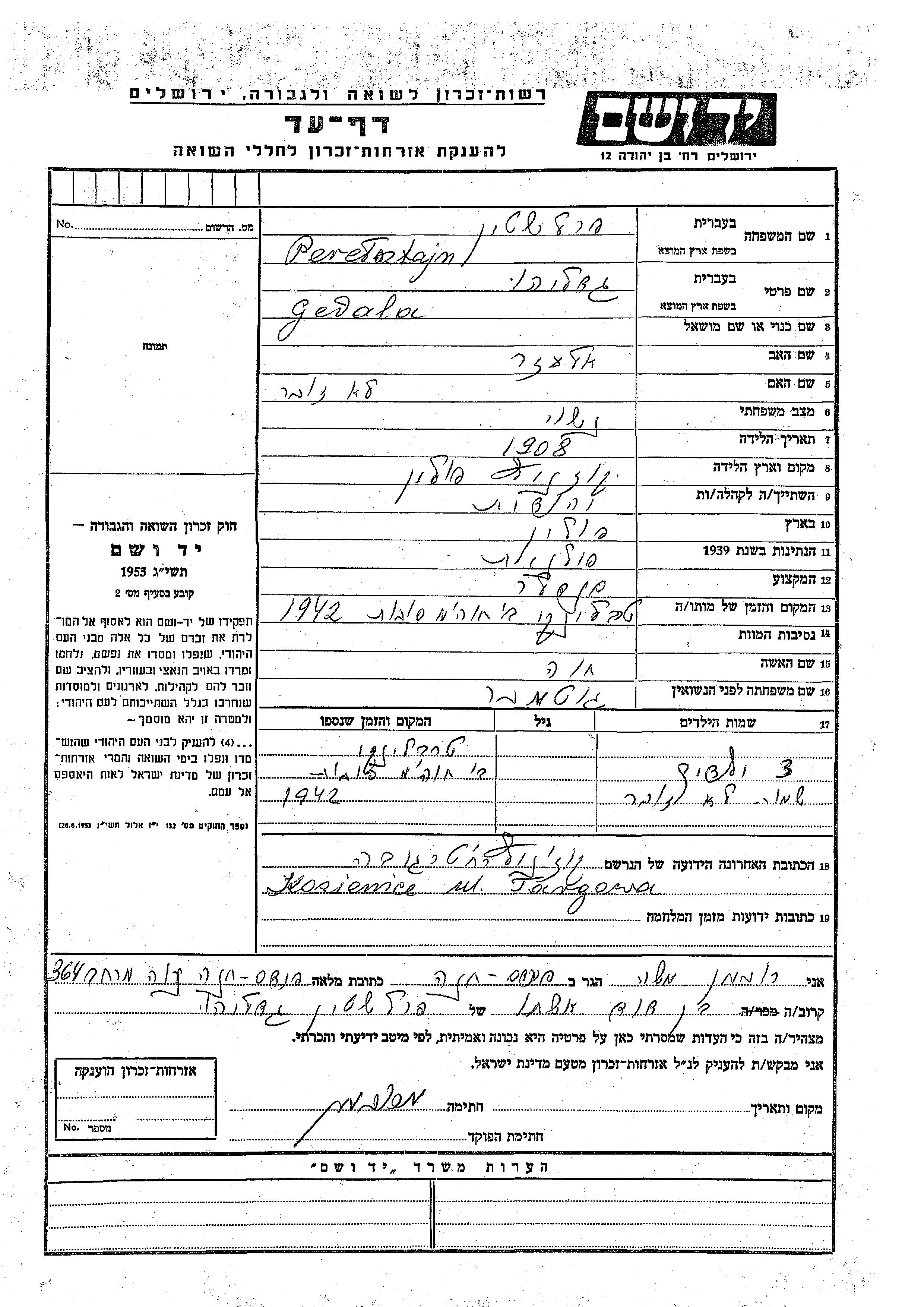 Perelsztajn Gedala 1908 Kozienice, Pologne Feuille de témoignage