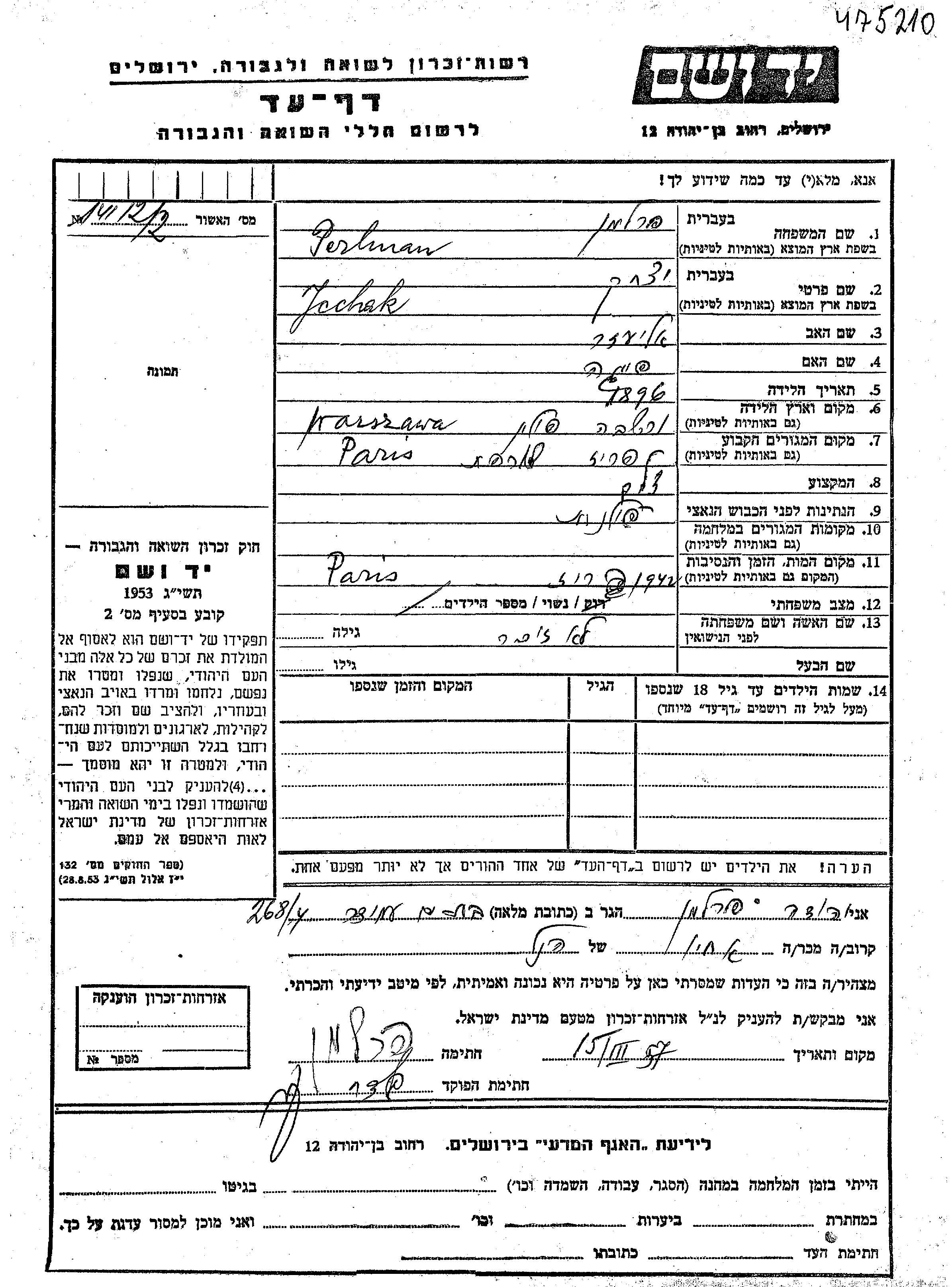 Perlman Ycchak 1896 Paris, France Feuille de témoignage