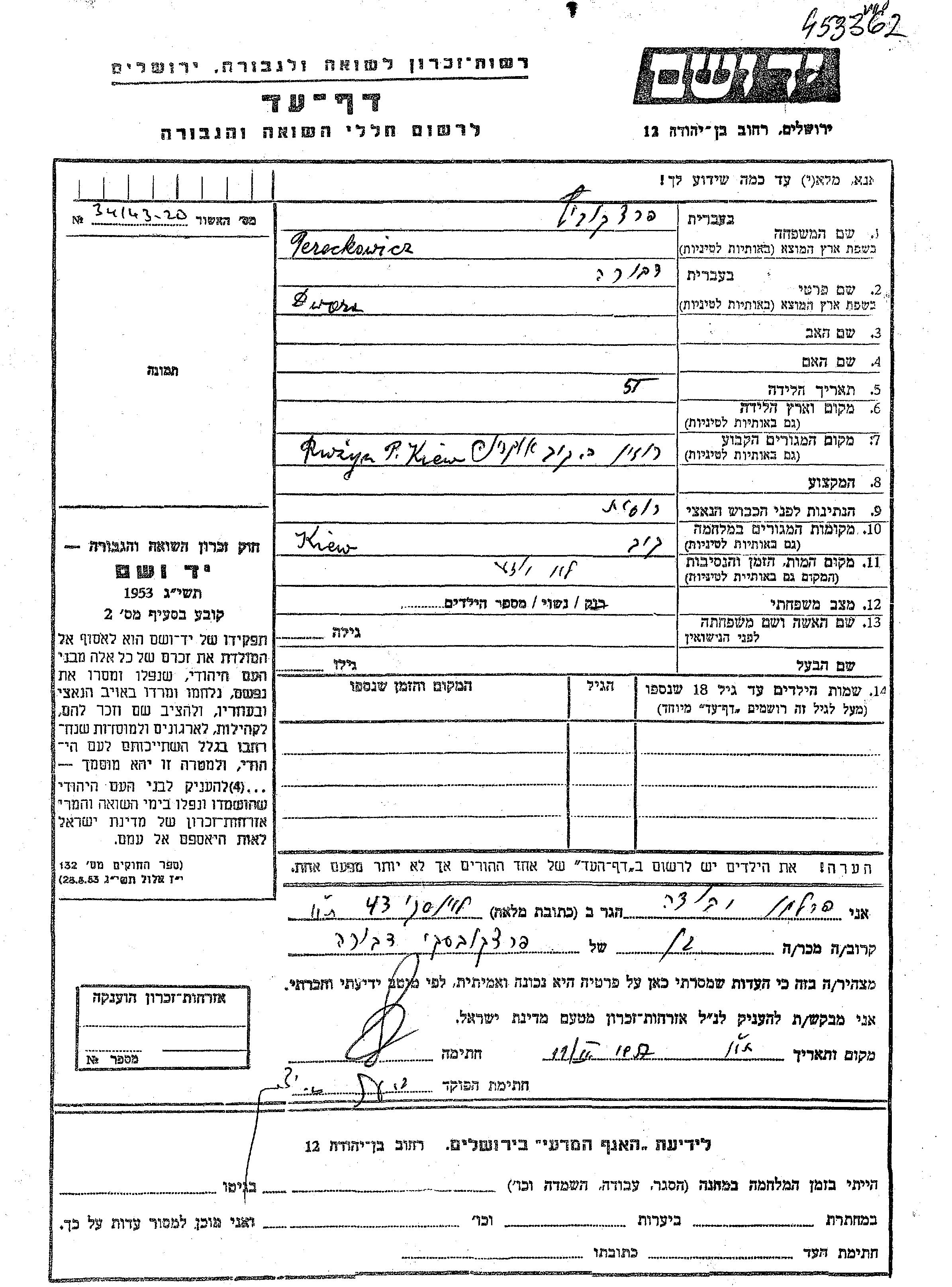 Dwora Pereckowicz. Elle était Mariée. Avant la seconde guerre mondiale elle vivait à Ruzin, Ukraine (URSS). Pendant la guerre, elle était à Kiew, Ukraine (URSS).