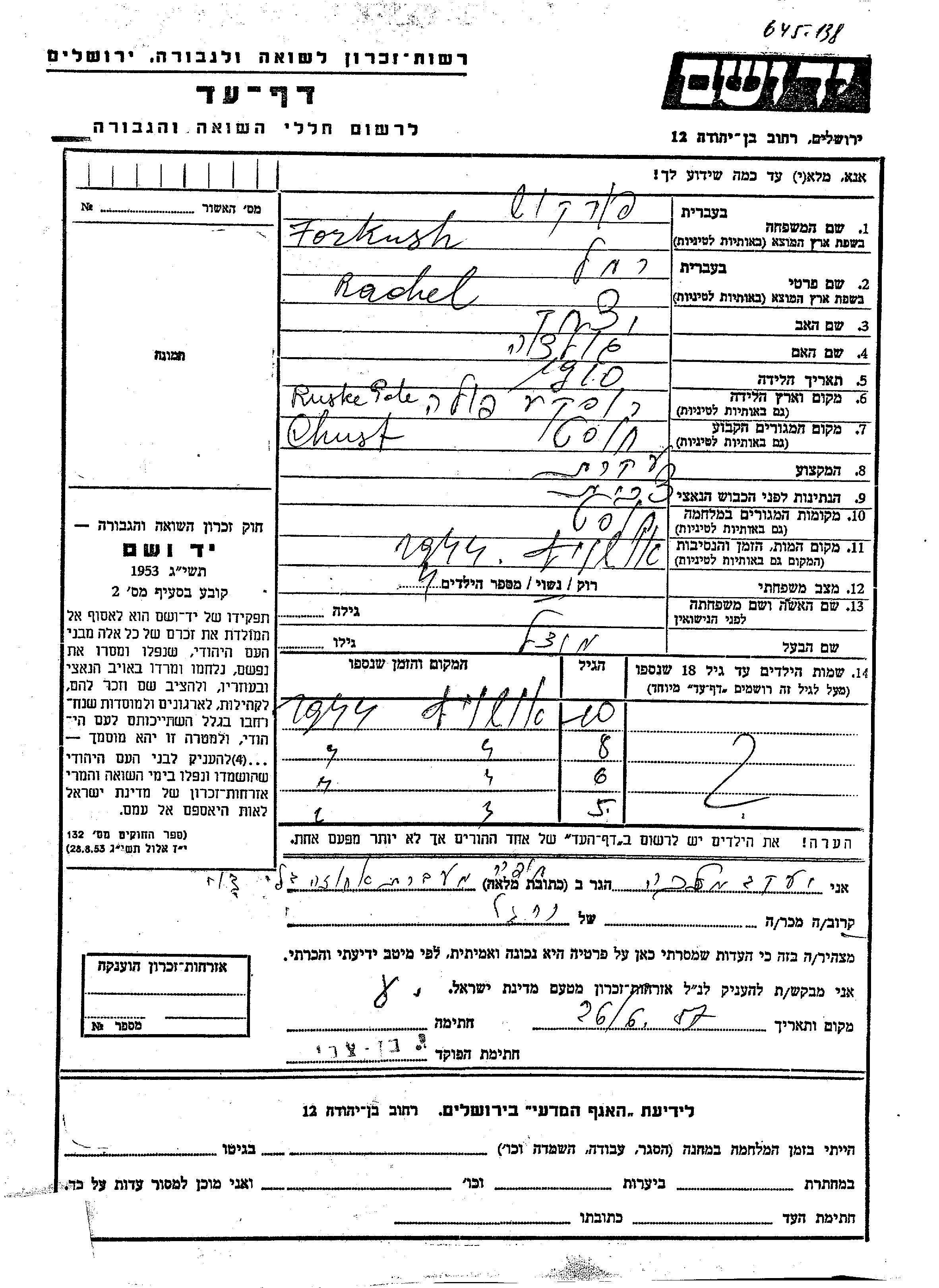 Forkush Rachel 1910 Chust, Tchécoslovaquie Feuille de témoignage