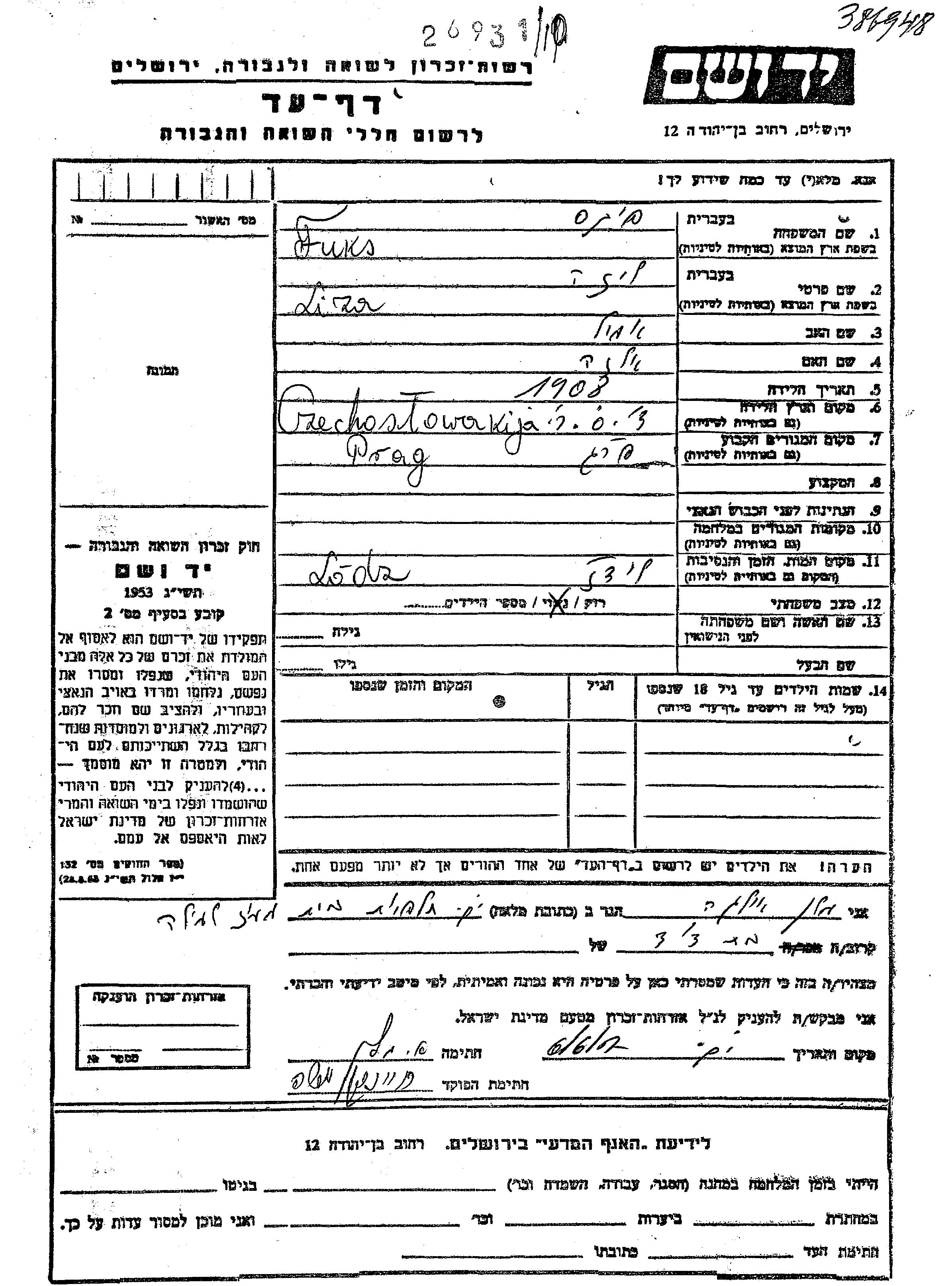Fuks Liza 1908 Prag, Tchécoslovaquie Feuille de témoignage