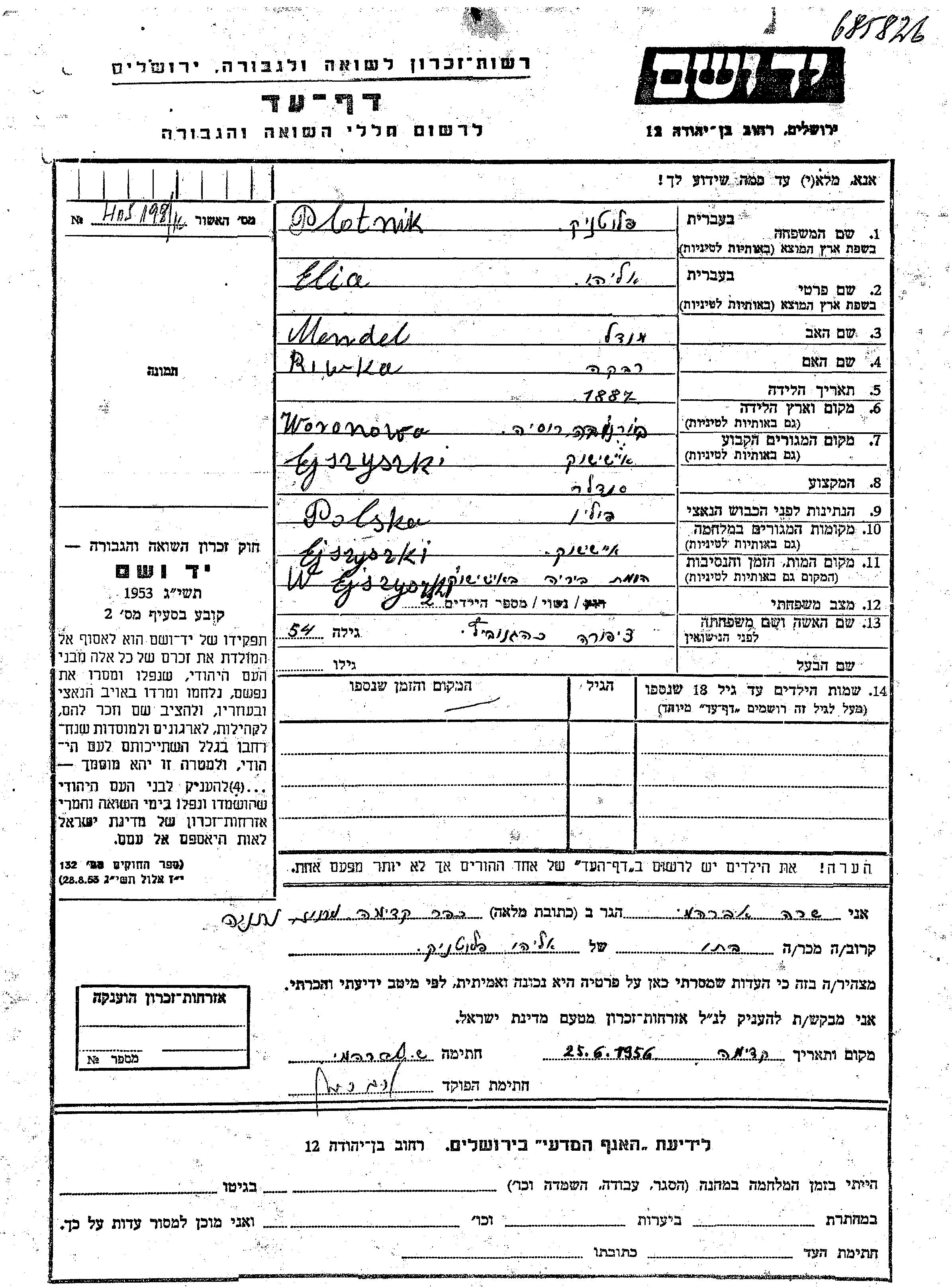 Elia Eliahu Plotnik est né à Woronowo, Pologne en 1887, fils de Mendel et de Riwka. Il était Cordonnier et Mariée à Tzipora née Kaganovich. Avant la seconde guerre mondiale il vivait à Ejsziszak, Pologne. Au cours de la guerre, il était à Ejsziszak, Pologne.