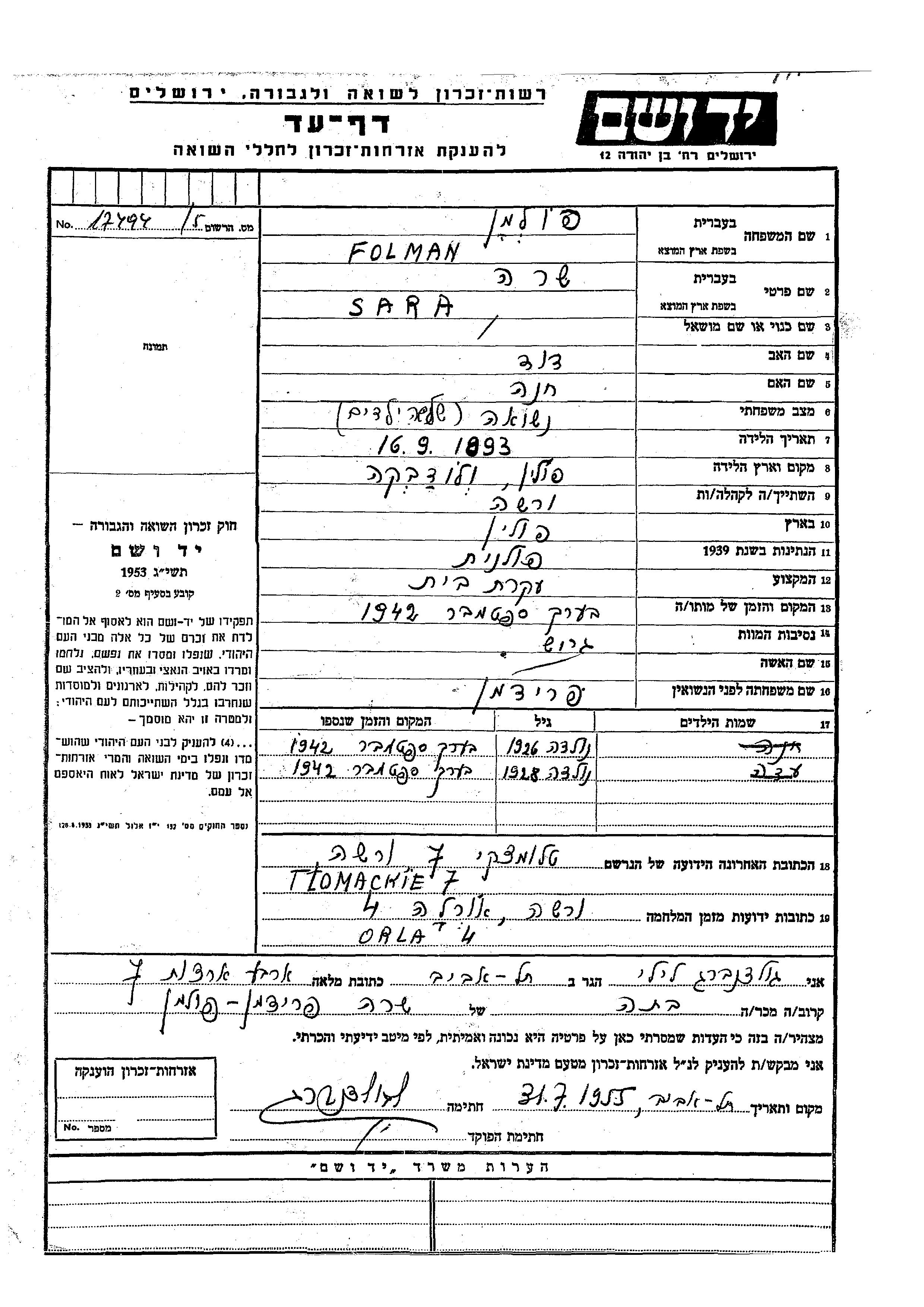 Sara Folman est née à Vlodavka, Pologne en 1893, fille de David et de Khana. Elle était Femme au foyer et Mariée. Avant la seconde guerre mondiale elle vivait à Orla, Pologne. Pendant la guerre, elle était à Tlomats, Pologne.