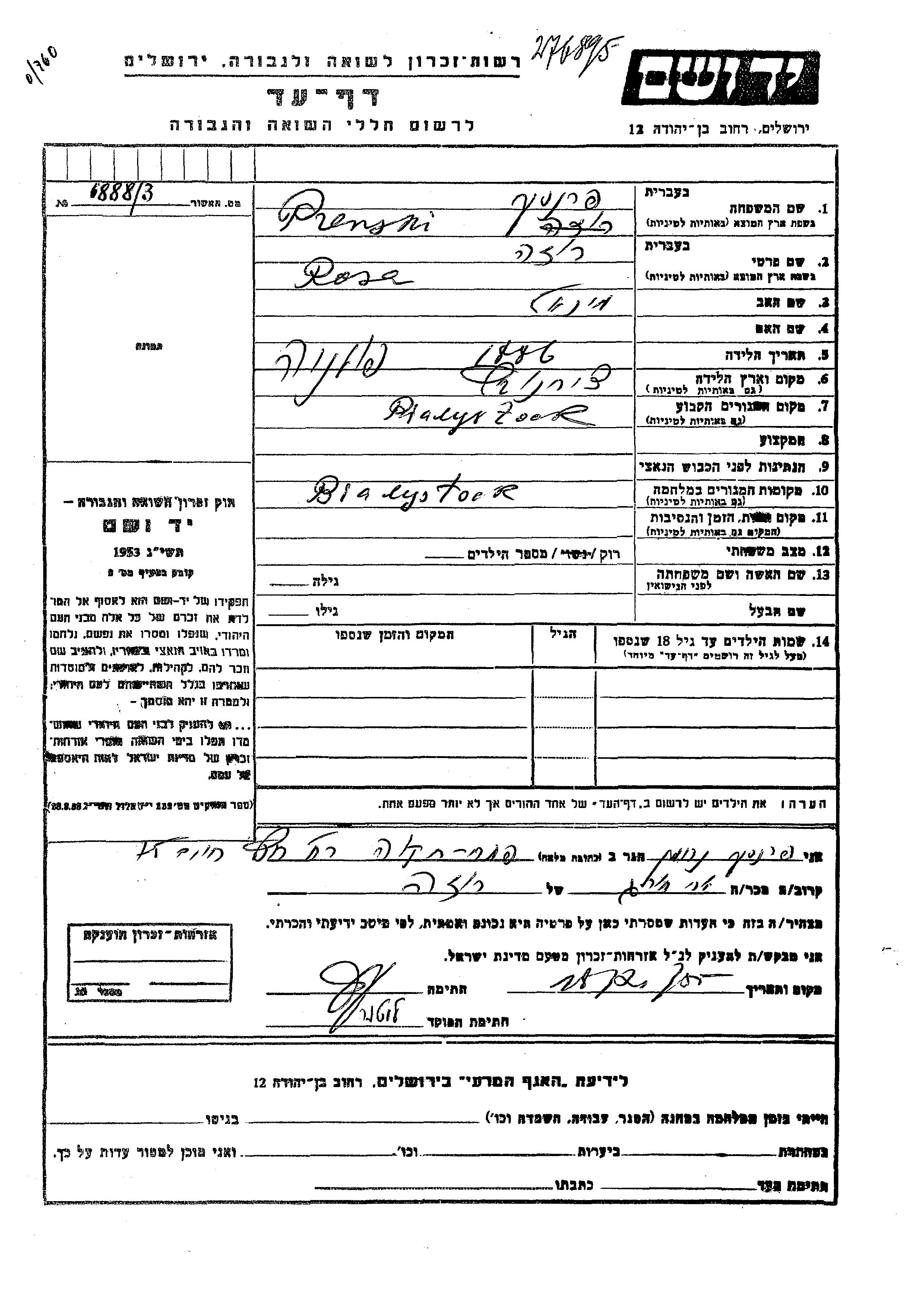 Prenski Rosa 1886 Bialystok, Pologne Feuille de témoignage
