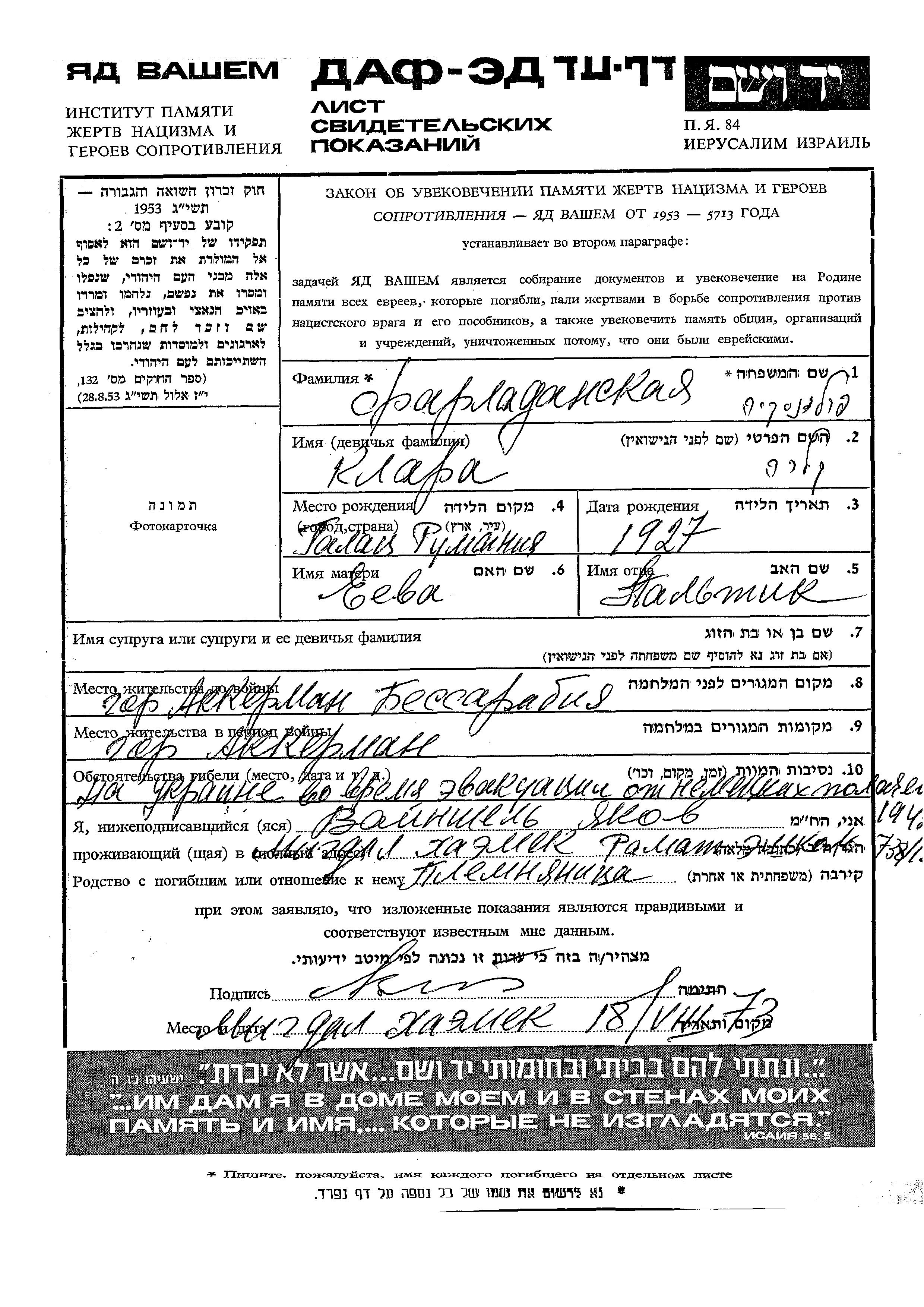 Farladanski Klara 1927 Akkerman, Roumanie Feuille de témoignage
