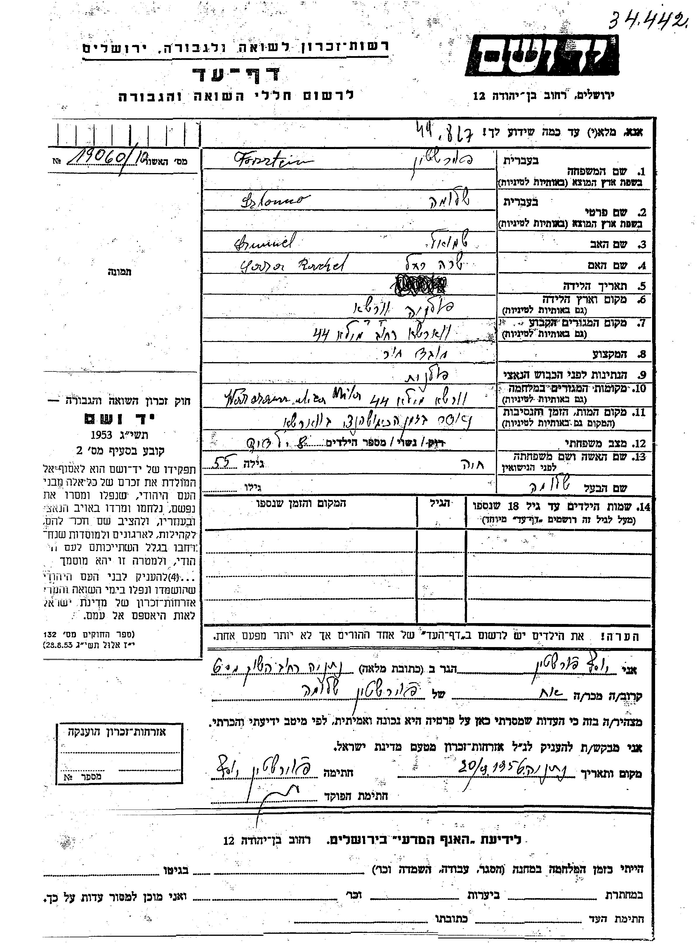 Forsztein Szlomo Warszawa, Pologne Feuille de témoignage