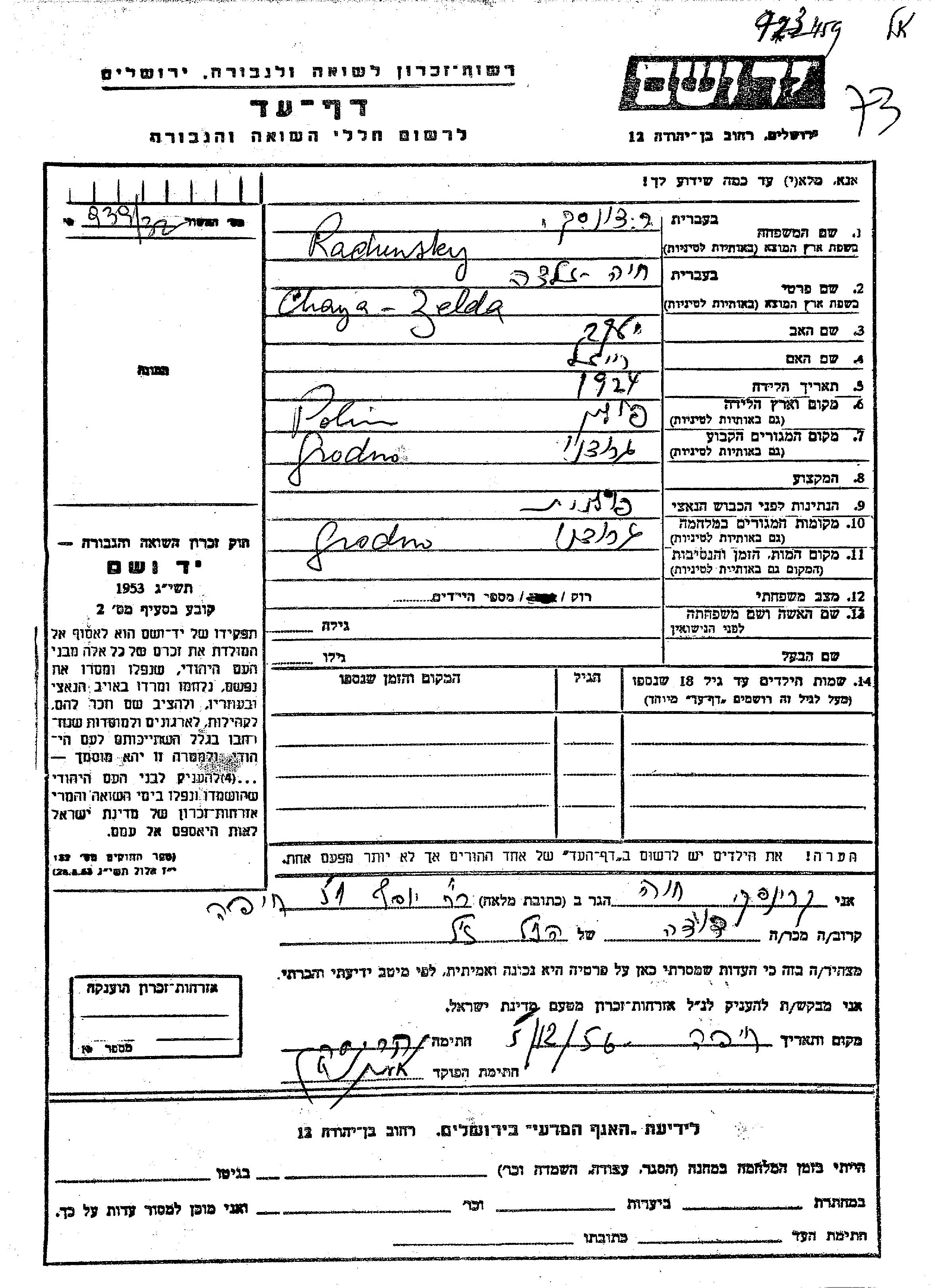 Rachinsky Ratzonski Chaja Zelda 1924 Grodno, Pologne Feuille de témoignage
