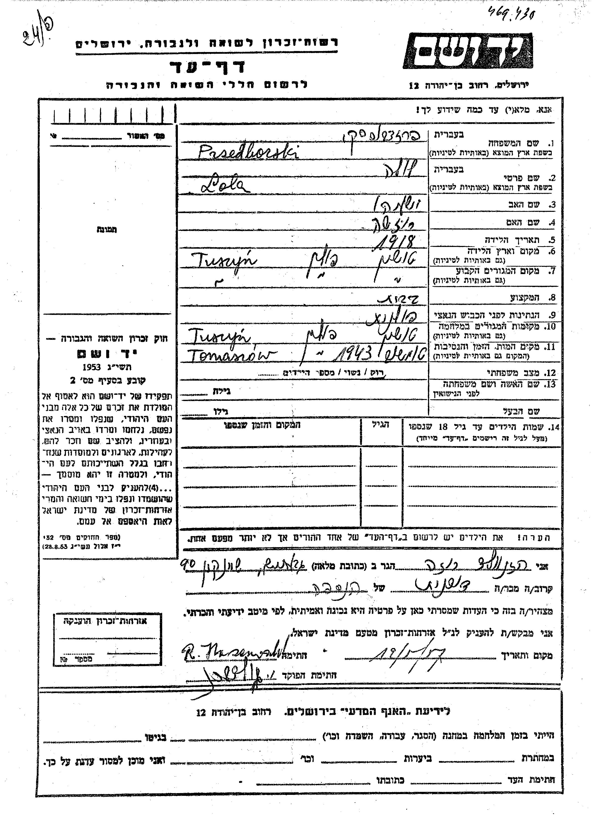 Przedborski Lola 1918 Tuszyn, Pologne Feuille de témoignage
