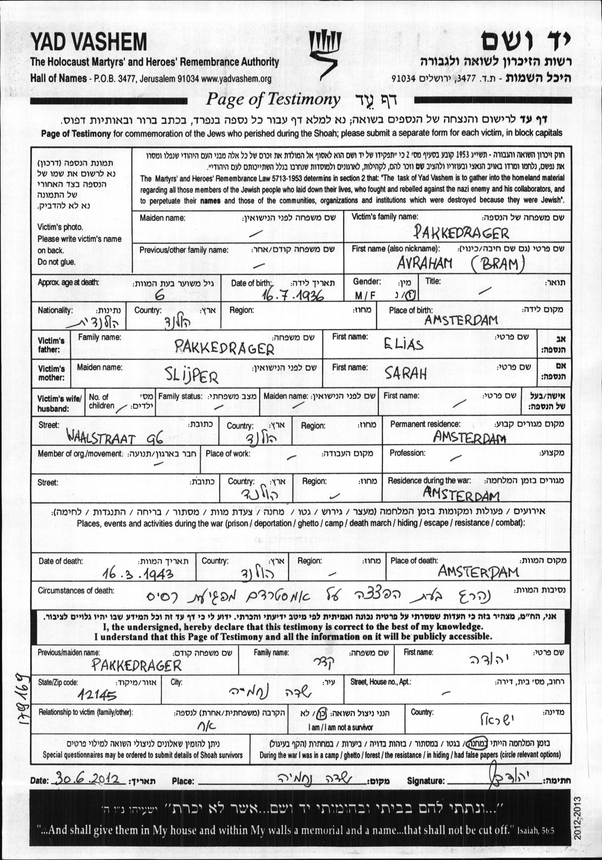 Avraham Pakkedrager est né à Amsterdam, Pays-Bas en 1936, fils de Elias et de Sarah née Slijper. Il était Enfant. Avant la seconde guerre mondiale il vivait à Amsterdam, Pays-Bas. Au cours de la guerre, il était à Amsterdam, Pays-Bas.