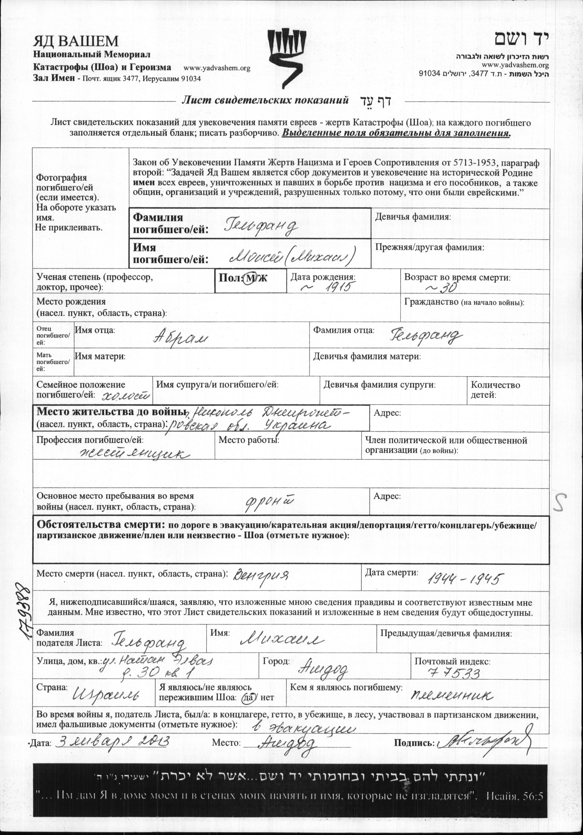 Gelfand Moisey Mikhail 1915 Nikopol, Ukraine (URSS) Feuille de témoignage