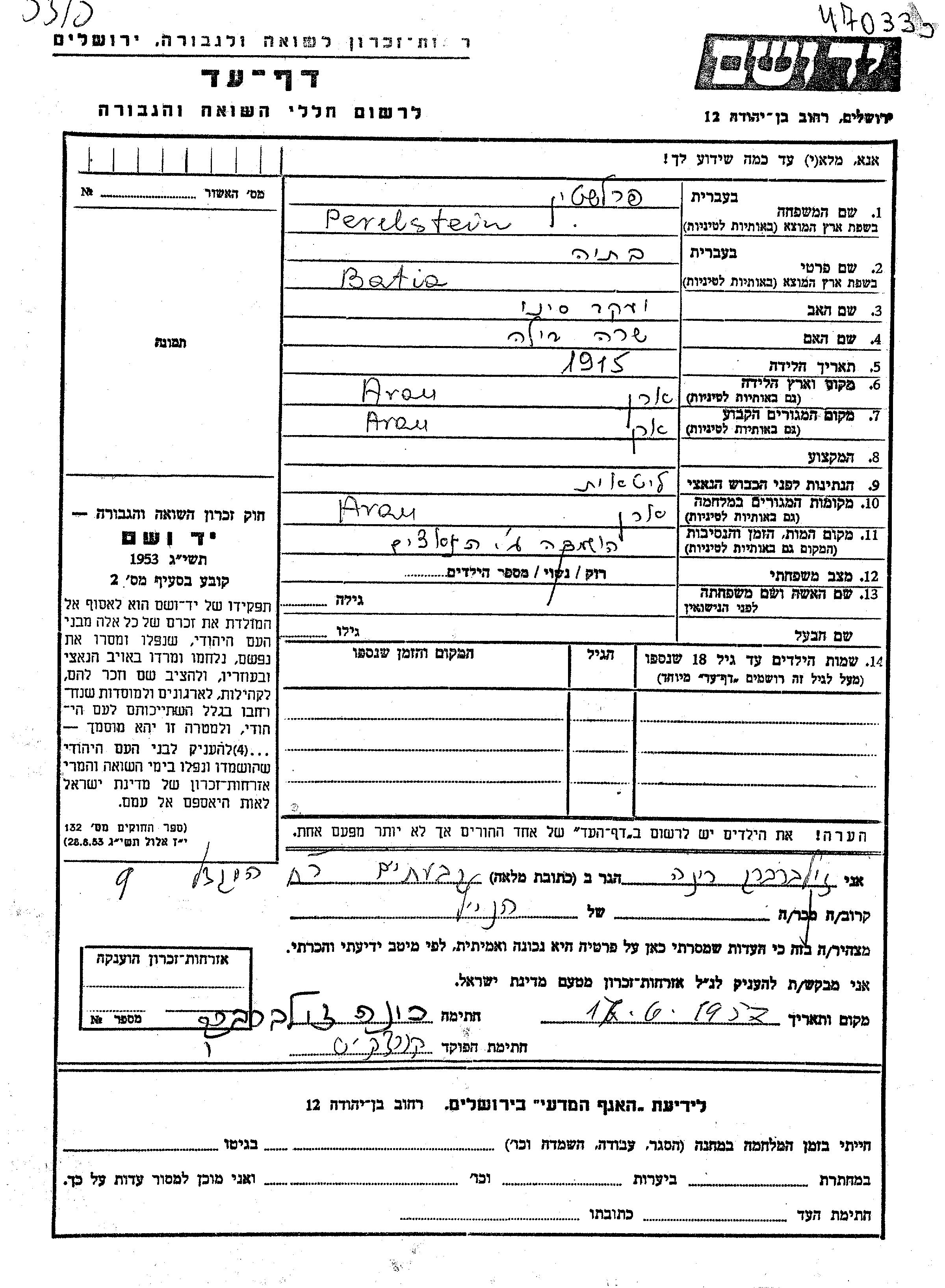 Perelstein Batia 1915 Aran, Pologne Feuille de témoignage