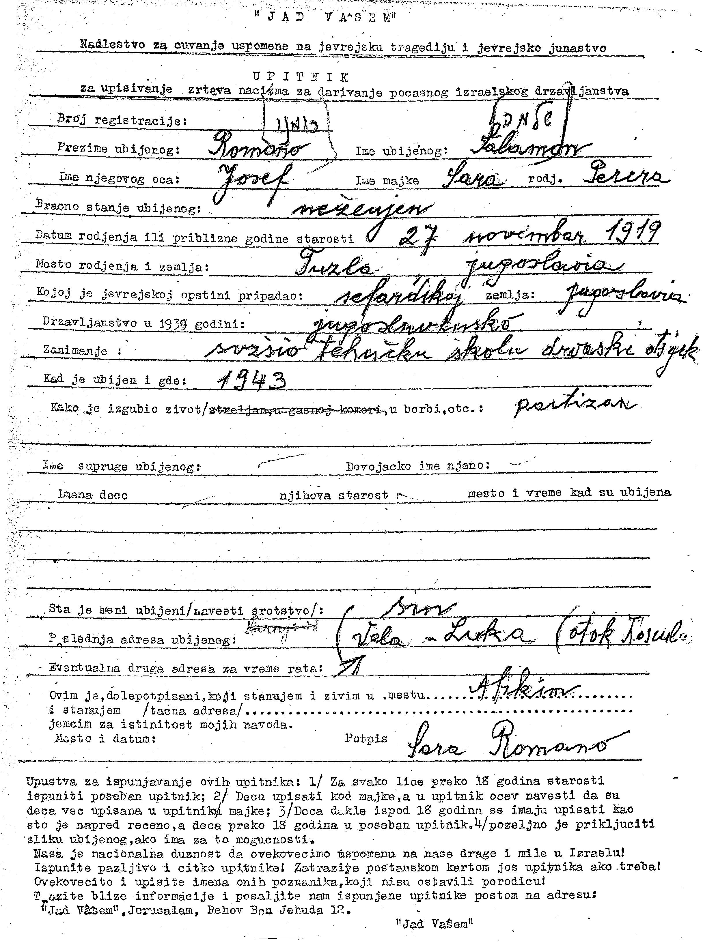 Salamon Romano est né à Tuzla, Yugoslavie en 1919, fils de Josef et de Sara. Il était Ingénieur forestier et Célibataire. Au cours de la guerre, il était à Vela Luka, Yugoslavie.