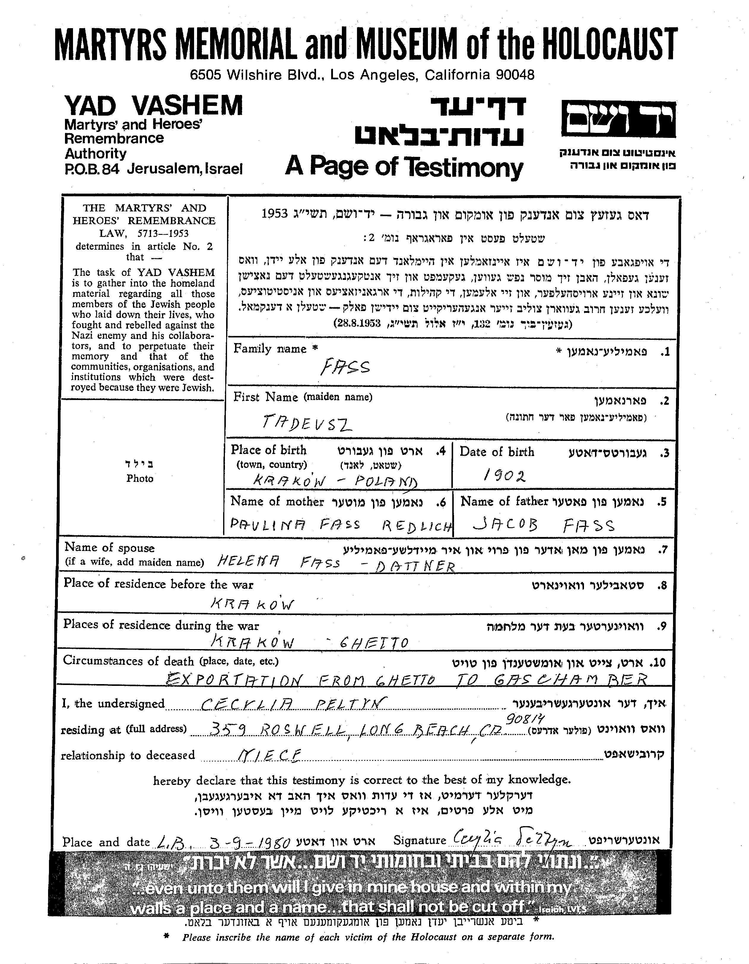 Yad Vashem - Pages of Testimony Names Memorial Collection