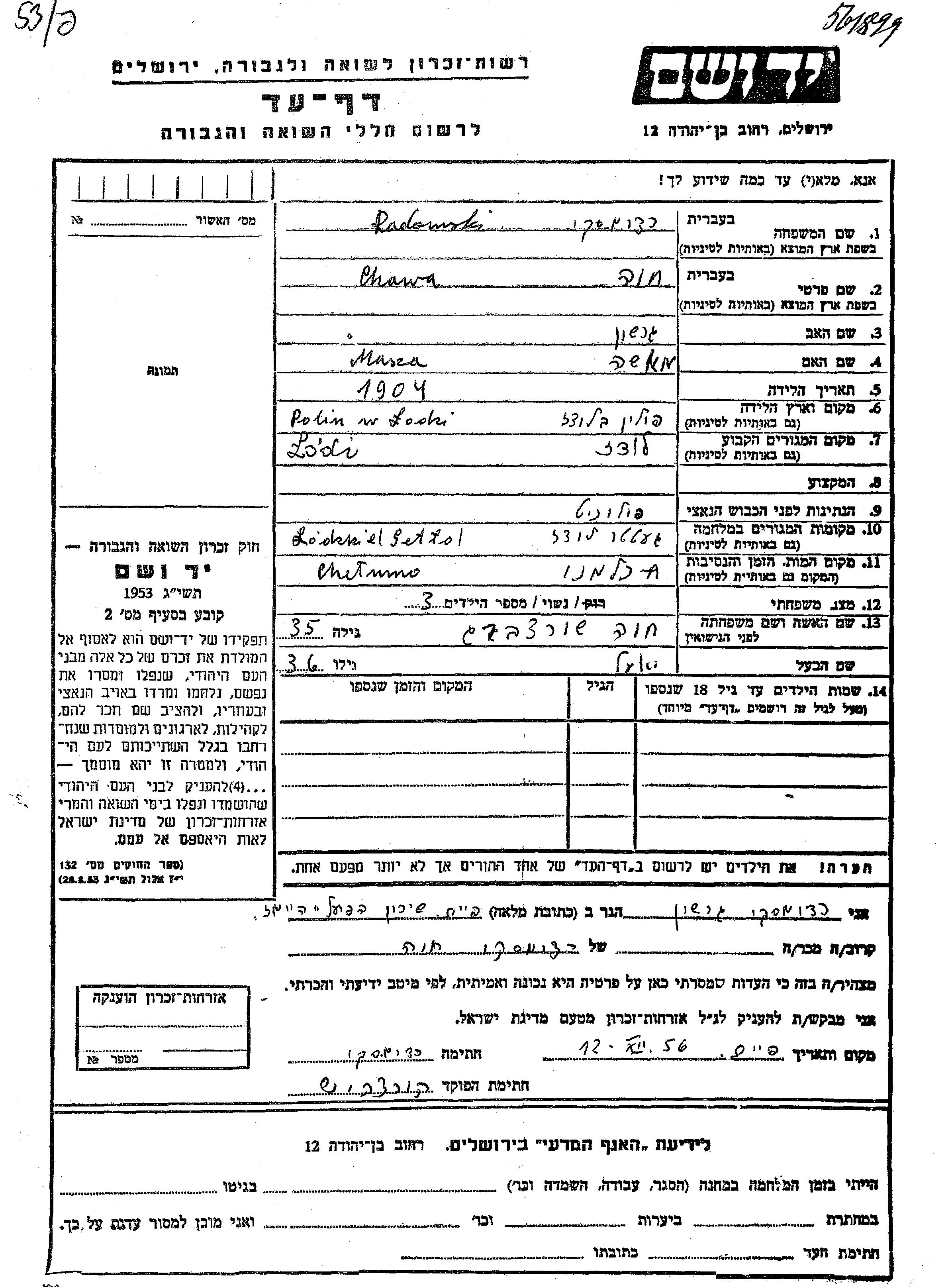 Radomski Chawa 1904 Lodz, Pologne Feuille de témoignage
