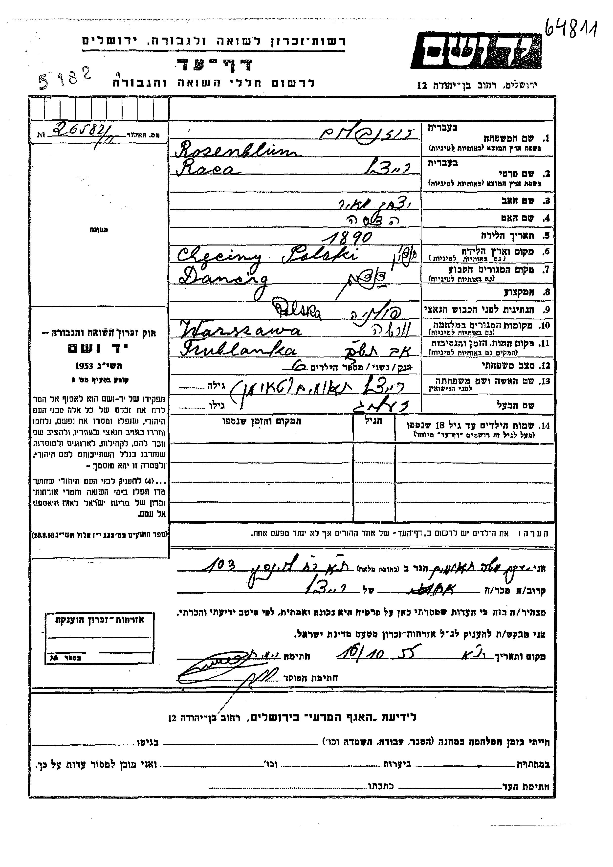 Raca Rozenblum née Teomim est née à Chęciny, Pologne en 1890, fille de Yitzkhak Meir et de Hadasa. Elle était Mariée à Zelig. Avant la seconde guerre mondiale elle vivait à Danzig, Ville Franche de Danzig. Pendant la guerre, elle était à Warszawa, Pologne.