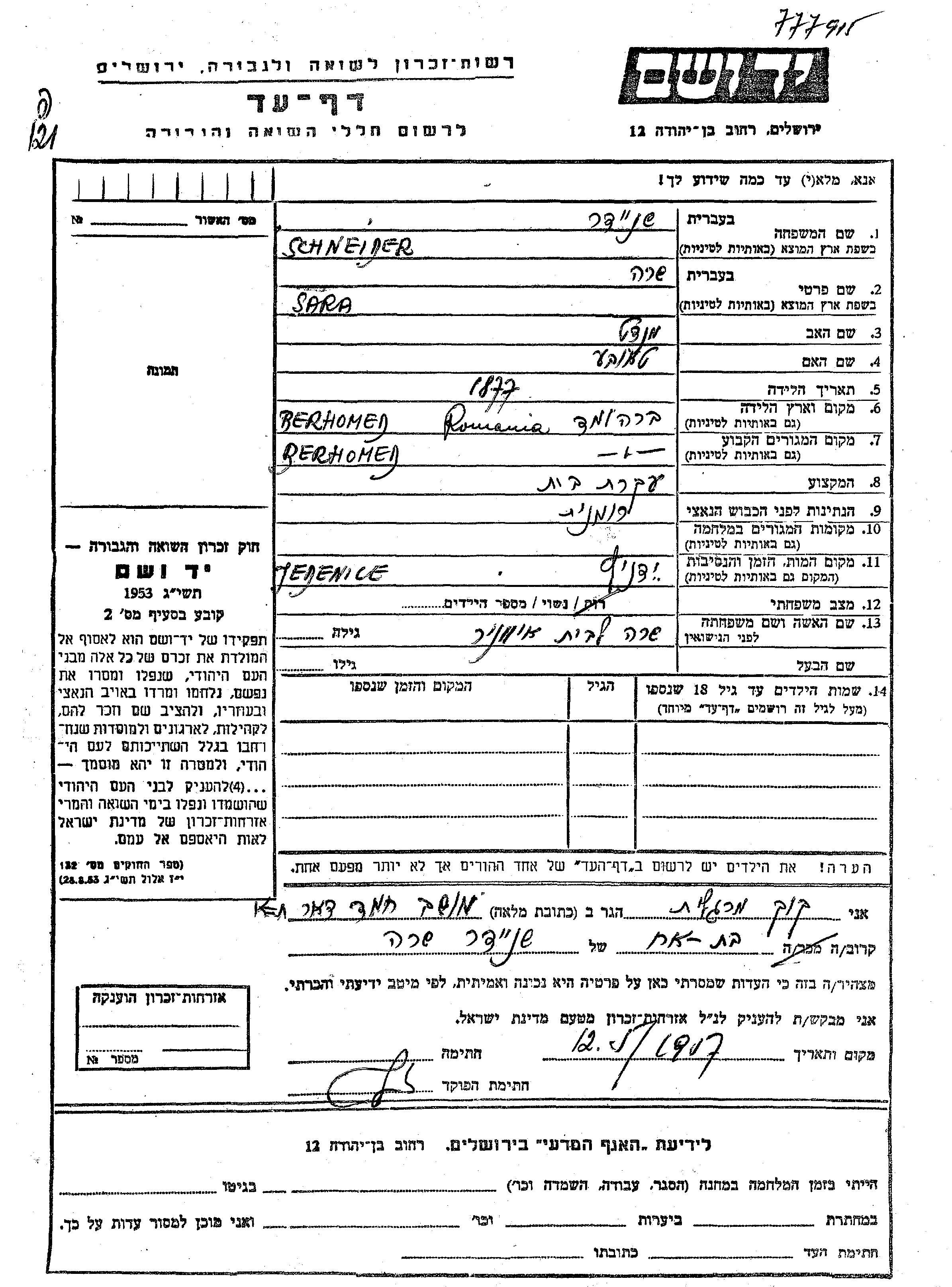 Schneider Sara 1877 Berhomed, Roumanie Feuille de témoignage