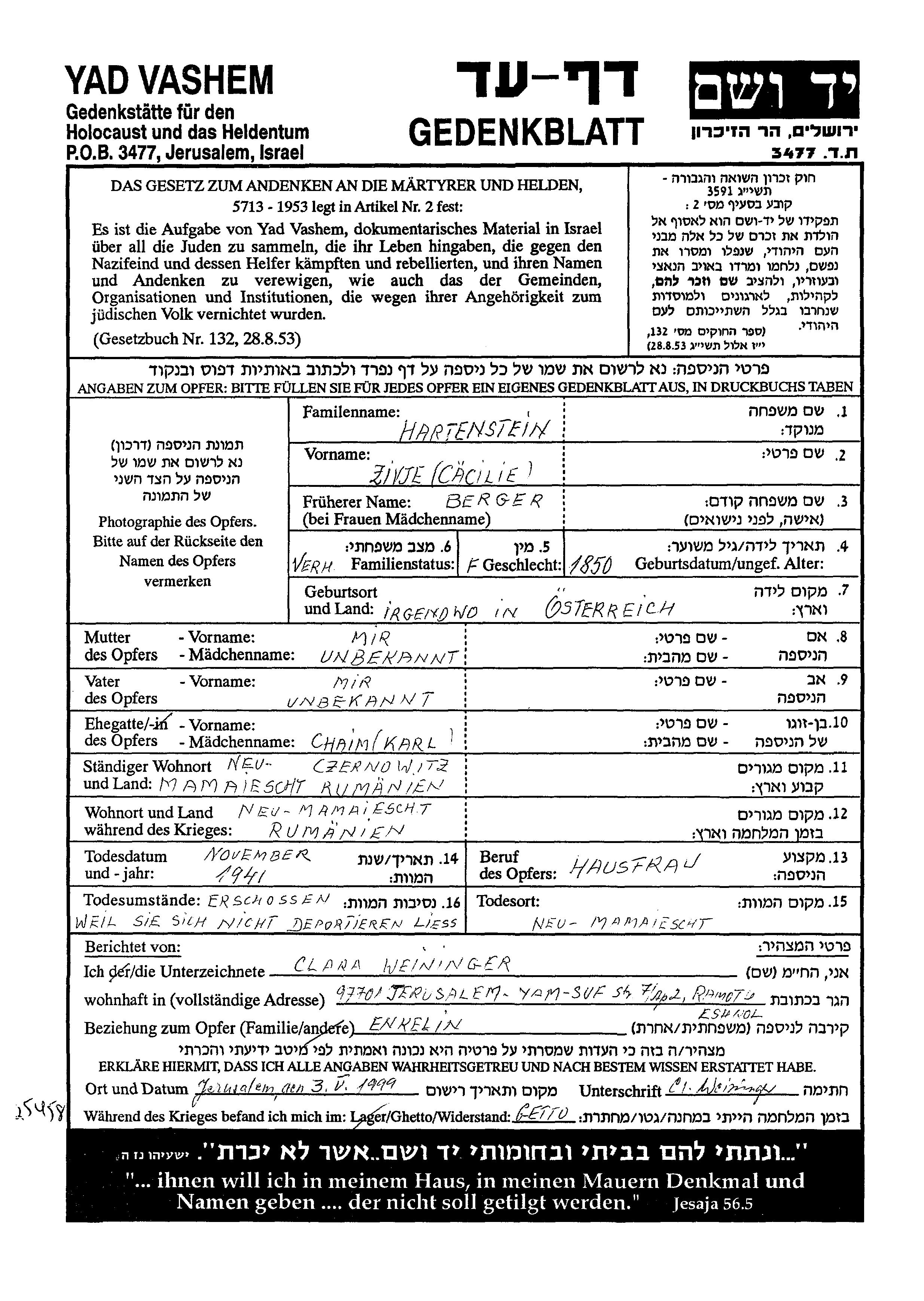 Zivja Cacilie Hartenstein née Berger est née à Autriche en 1850. Elle était Femme au foyer et Mariée à Chaim Karl. Avant la seconde guerre mondiale elle vivait à Mamaiesti Noi, Roumanie. Pendant la guerre, elle était à Mamaiesti Noi, Roumanie.