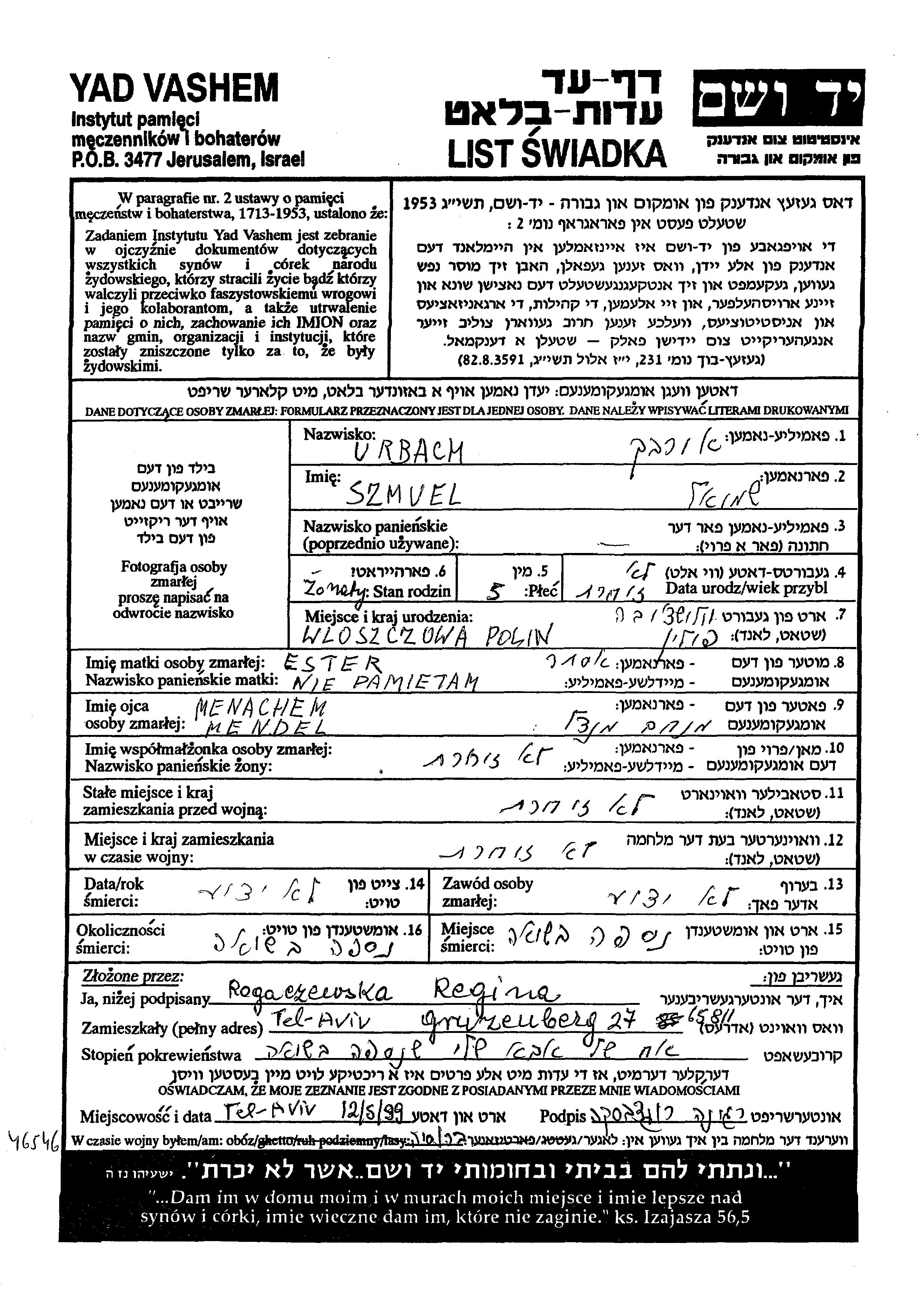 Urbakh Szmuel endroit inconnu, Feuille de témoignage