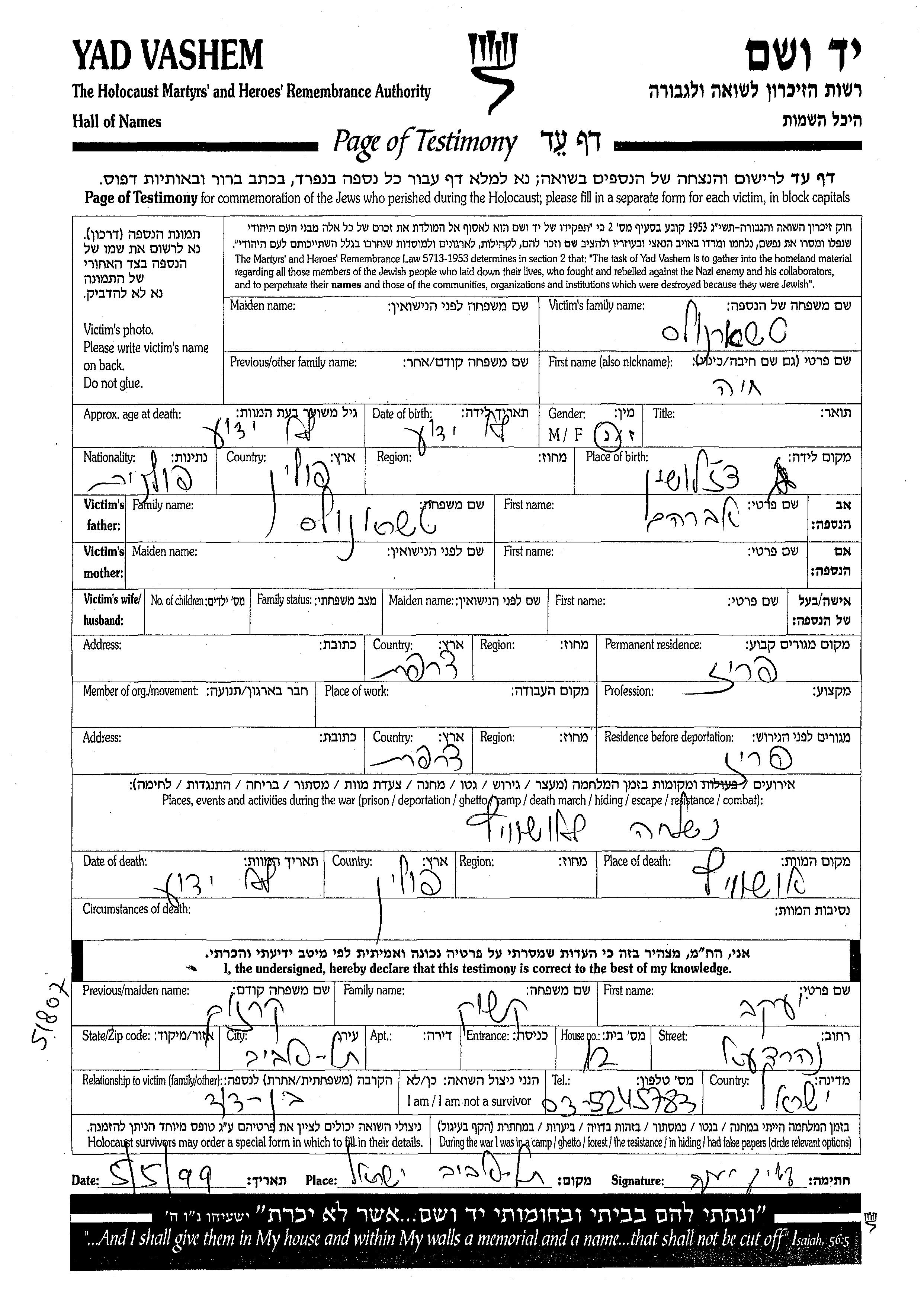 Yad Vashem - Pages of Testimony Names Memorial Collection