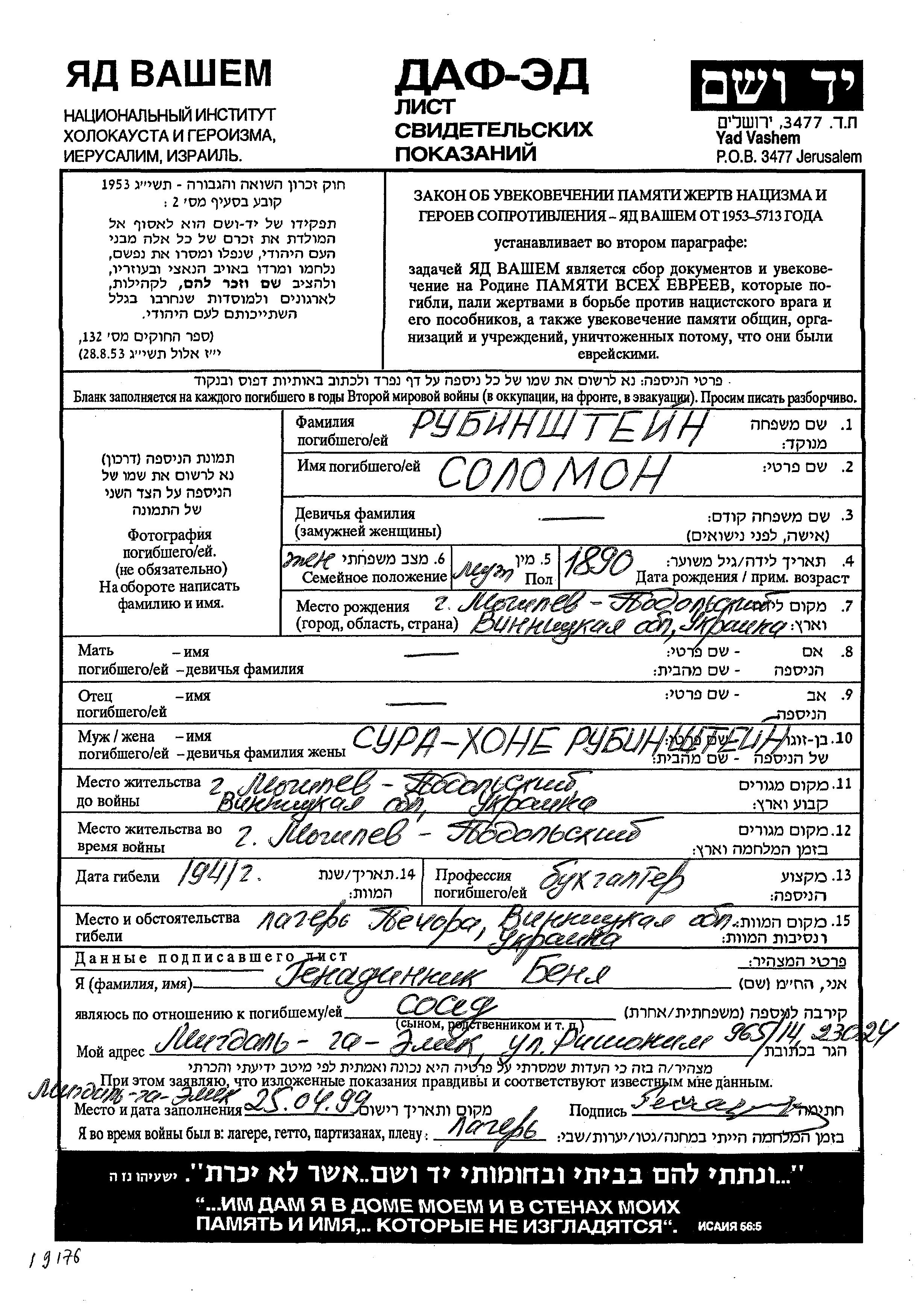 Solomon Rubinshtein est né à Mogilev Podolski, Ukraine (URSS) en 1890. Il était Comptable et Mariée à Sura Khone. Avant la seconde guerre mondiale il vivait à Mogilev Podolski, Ukraine (URSS). Au cours de la guerre, il était à Mogilev Podolskiy, Ukraine (URSS).