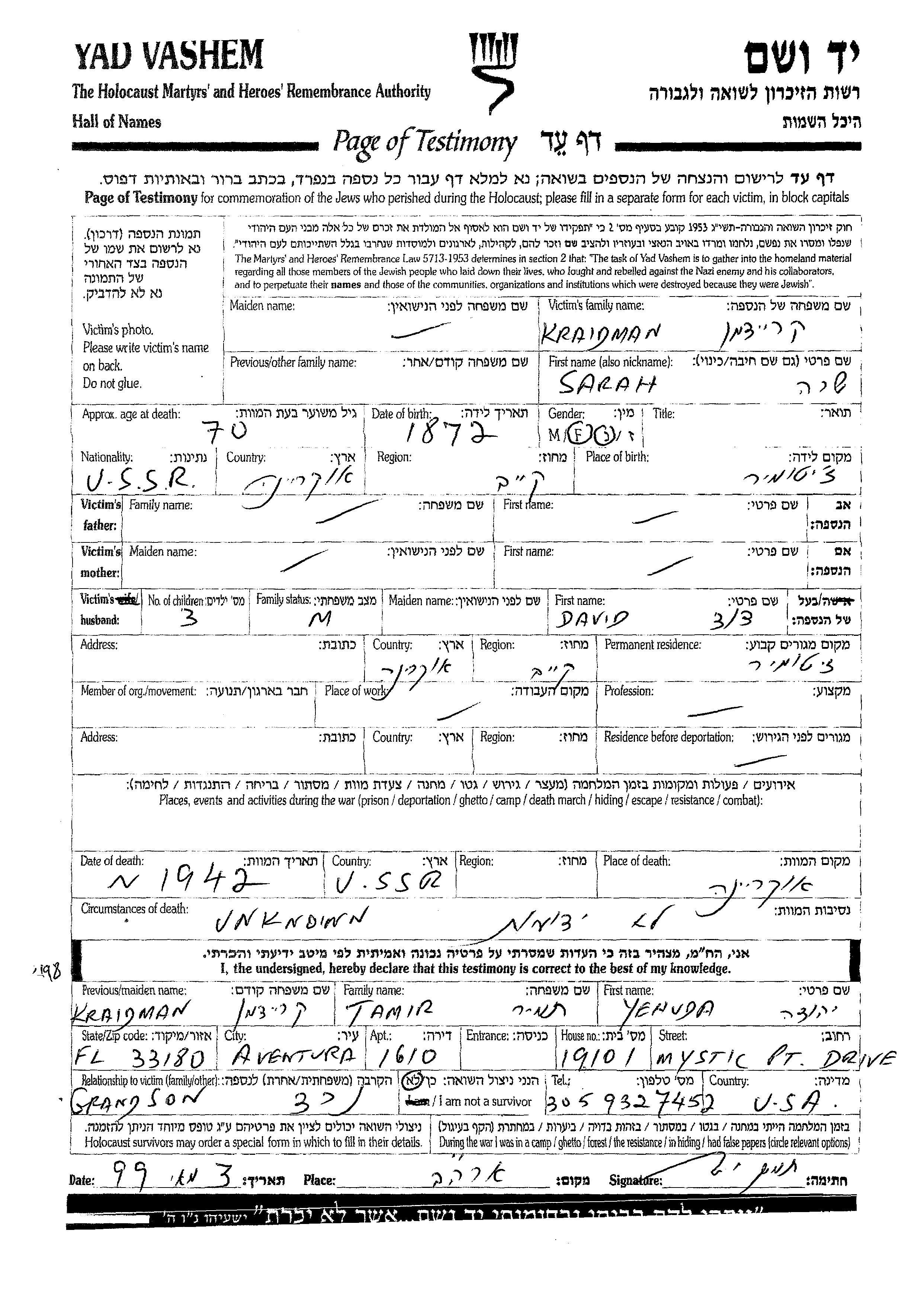 Kraidman Sarah 1872 Zitomir, Ukraine (URSS) Feuille de témoignage