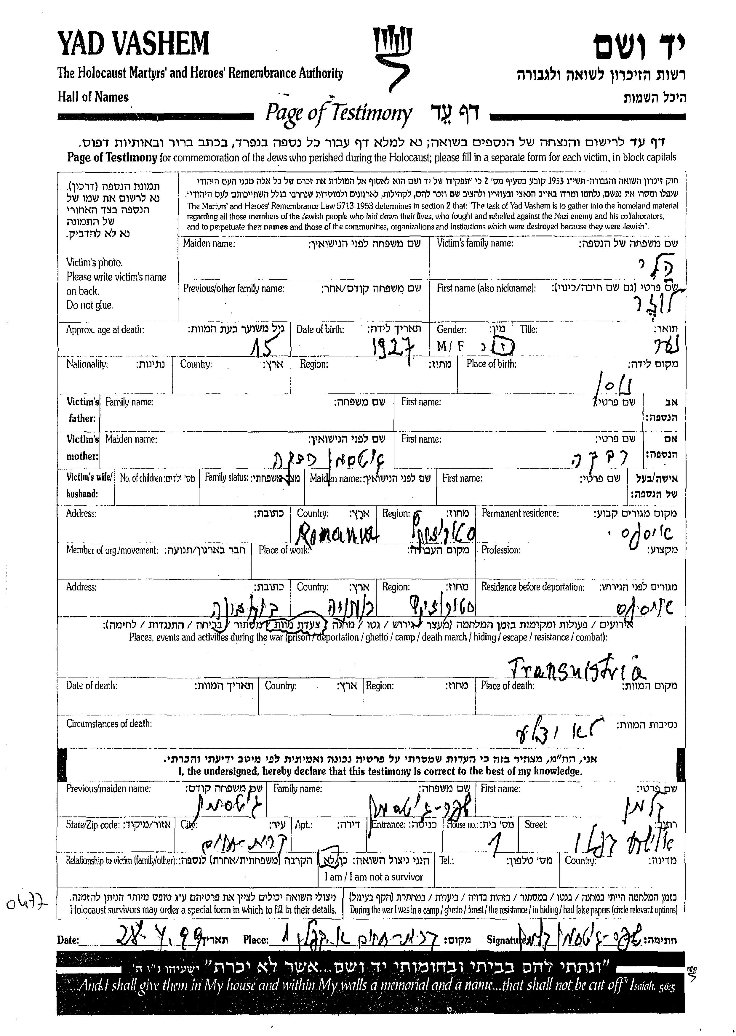 Yad Vashem - Pages of Testimony Names Memorial Collection