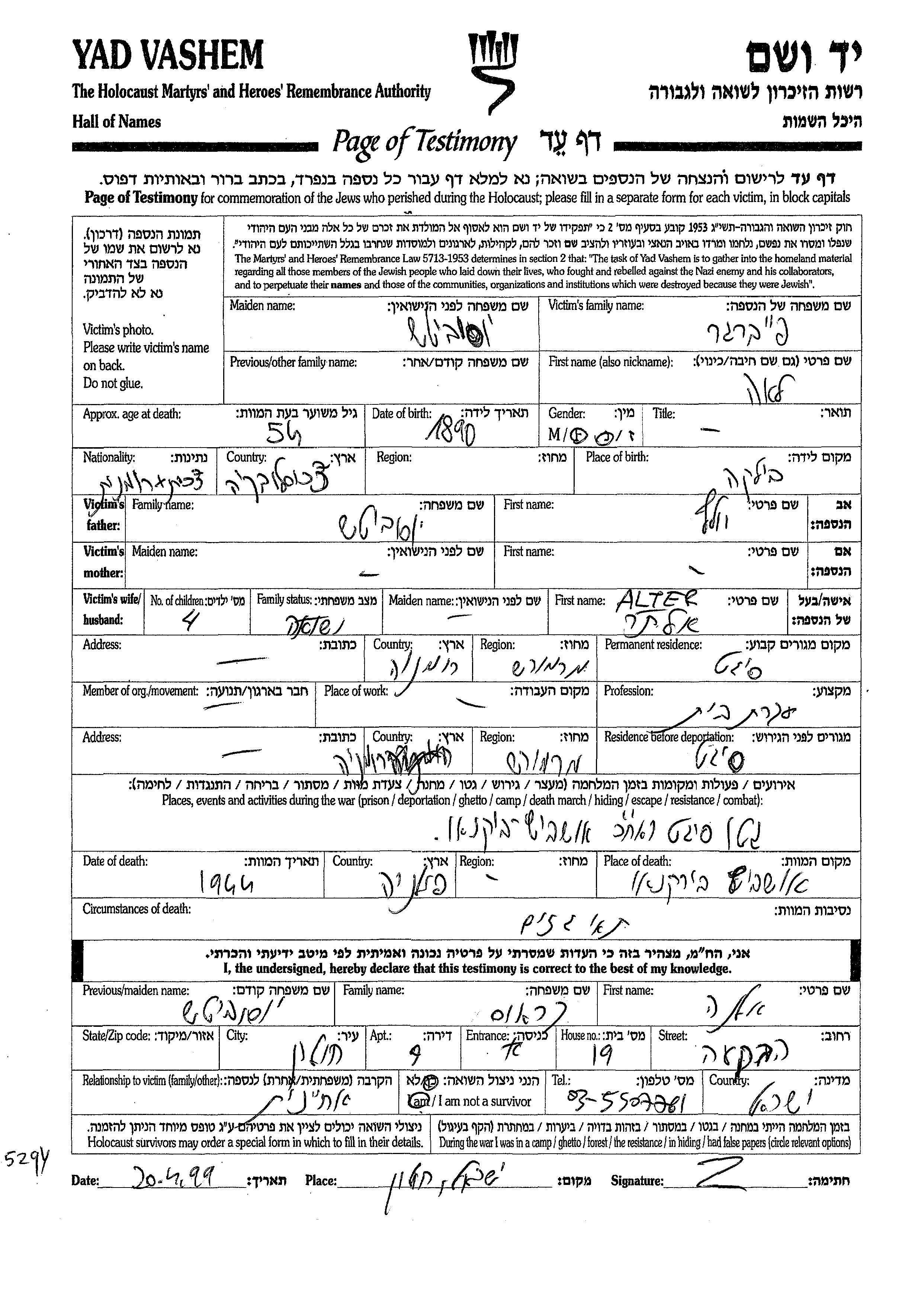 Yad Vashem - Pages of Testimony Names Memorial Collection